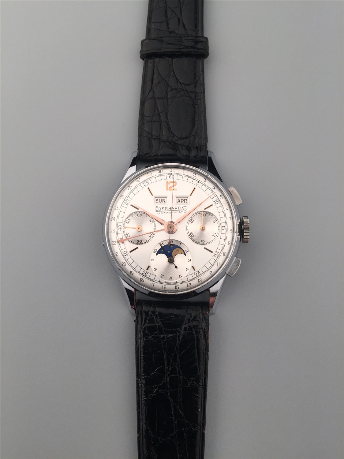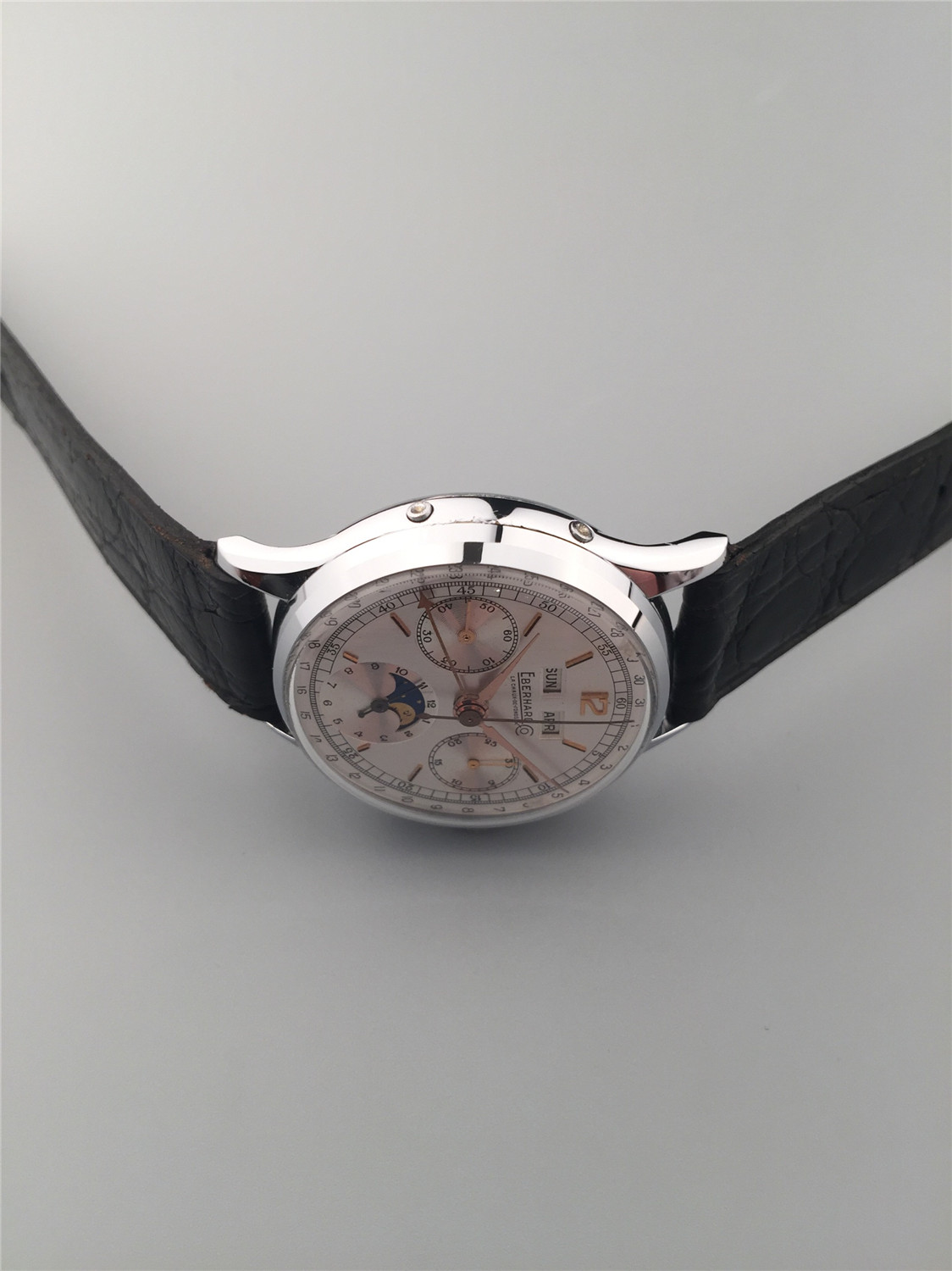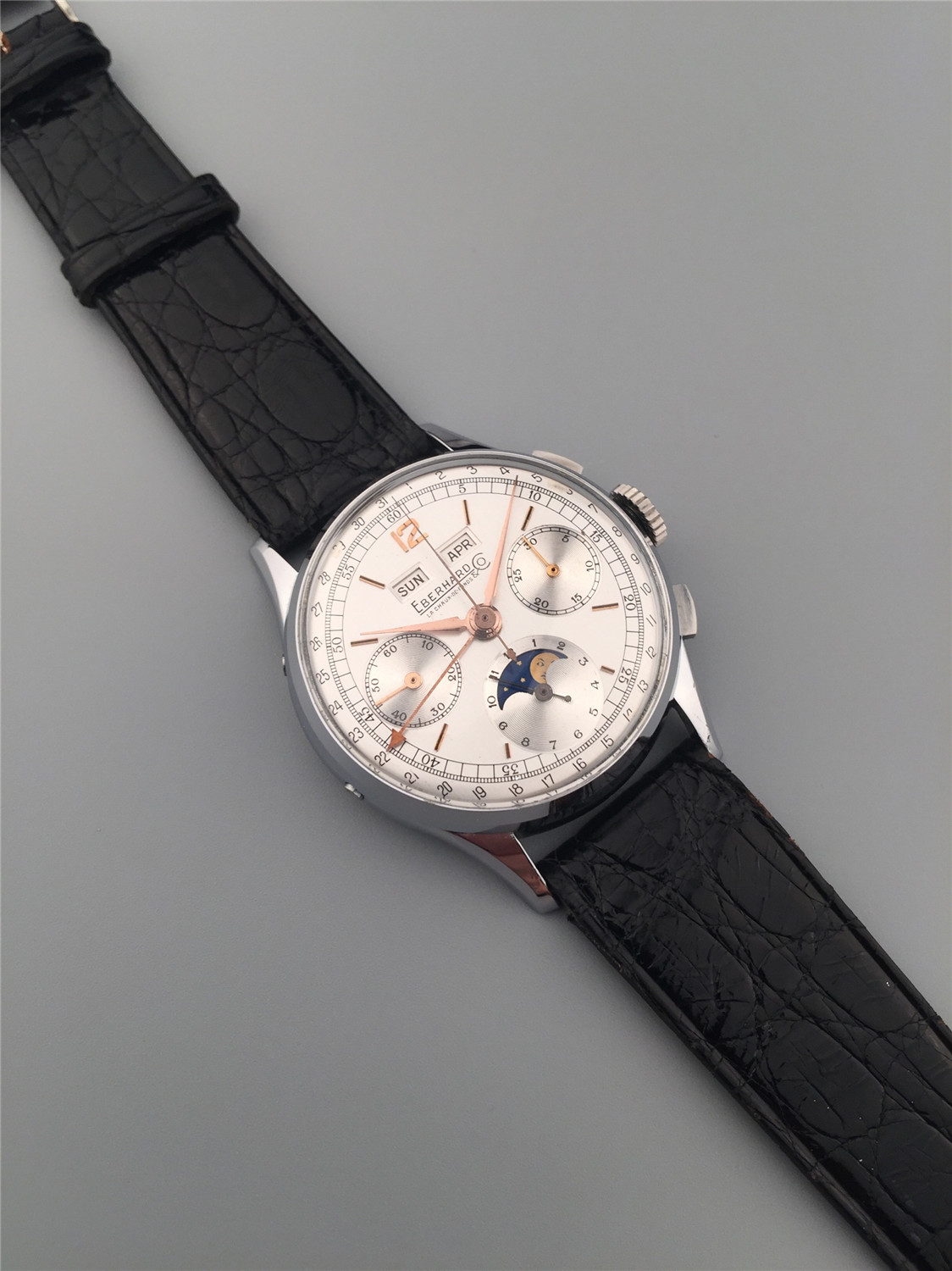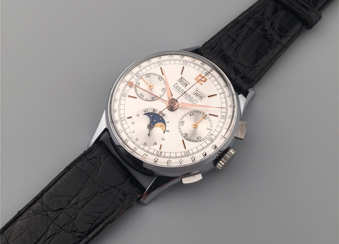 Eberhard男士計時腕錶,鋼材質,月份、星期和日曆顯示,手上鏈機芯,36mm,約1960年代,附原裝盒、證。