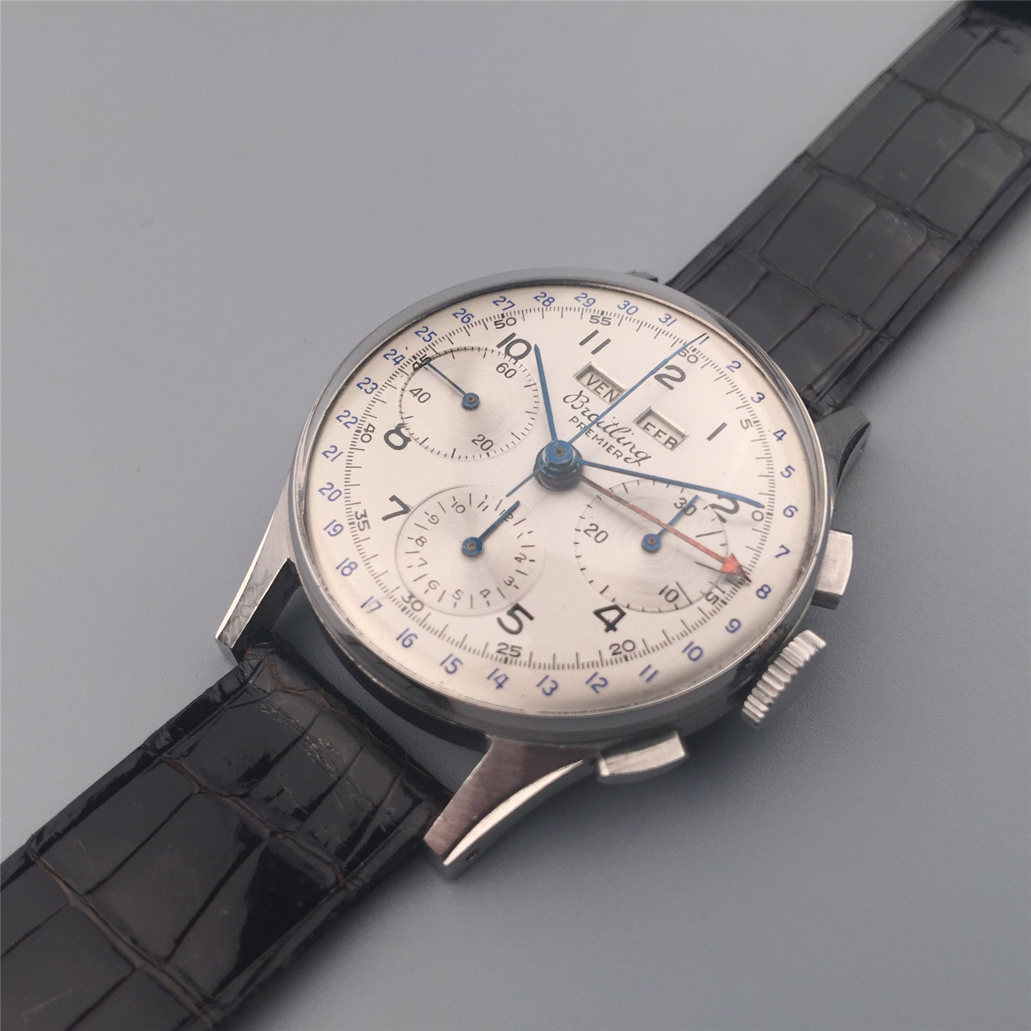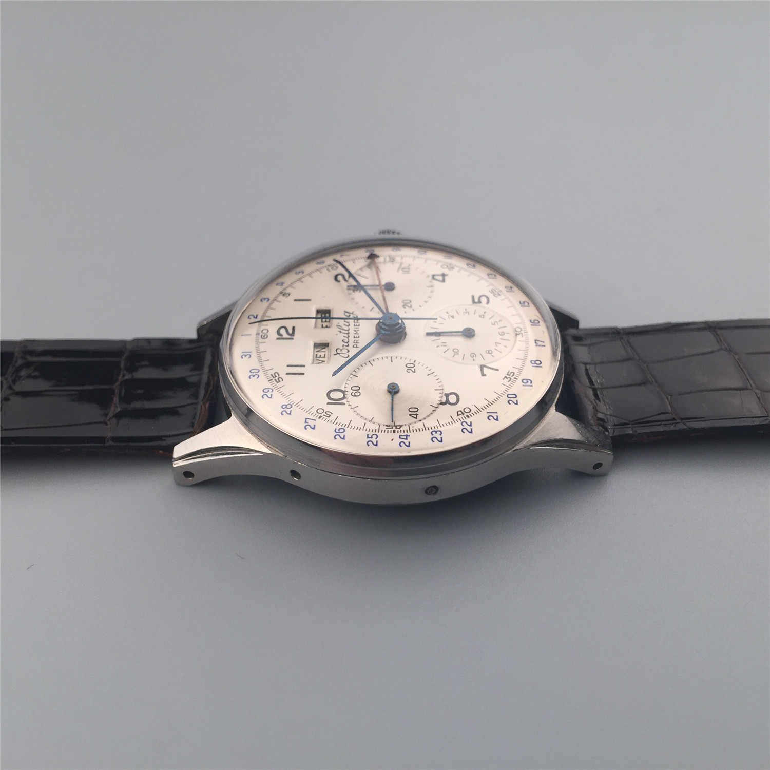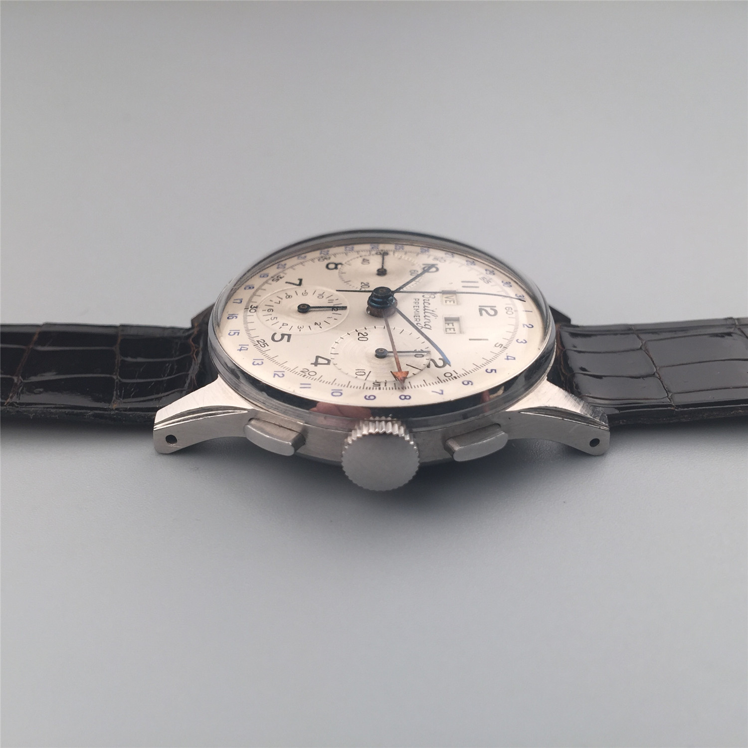 百年灵计时表,约1950年代,钢材质,年历及计时。银盘,数字时标,外圈日历环,星期及月份窗口显示。