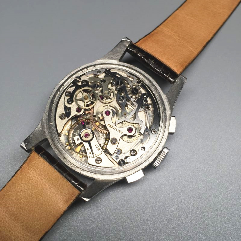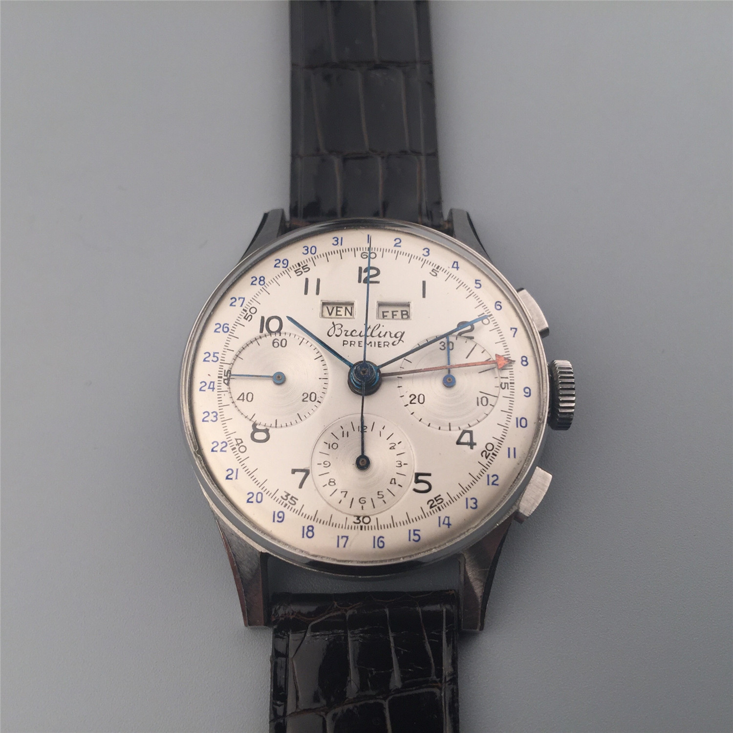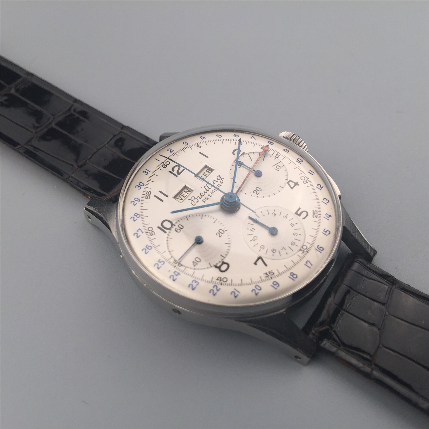 百年灵计时表,约1950年代,钢材质,年历及计时。银盘,数字时标,外圈日历环,星期及月份窗口显示。