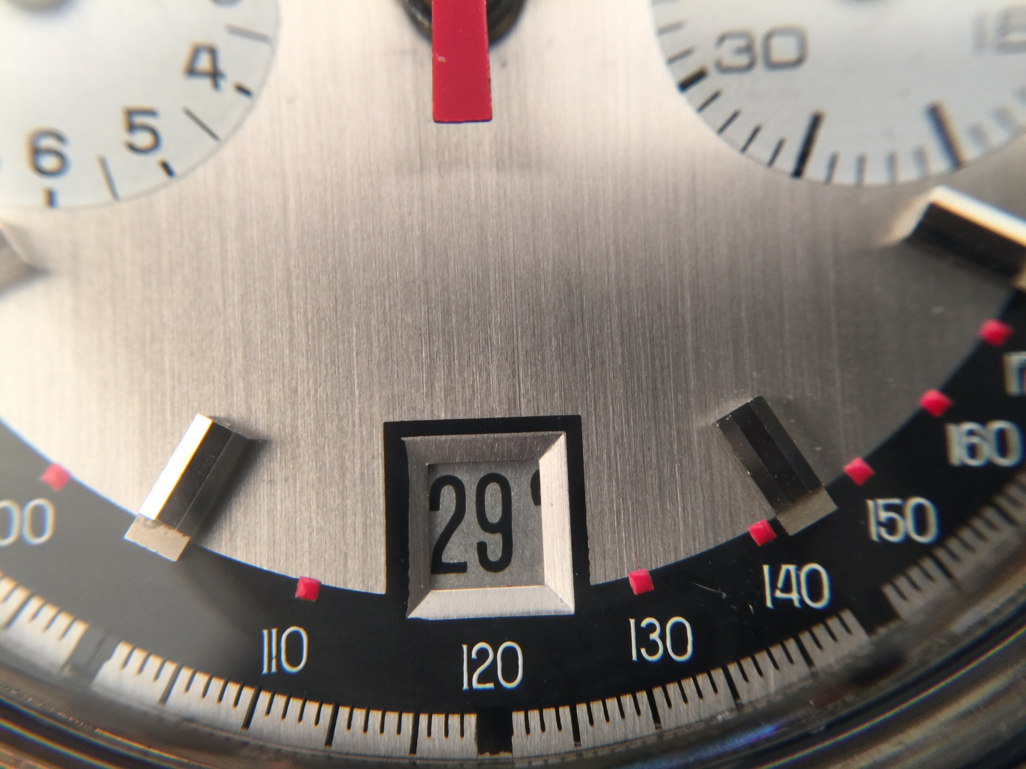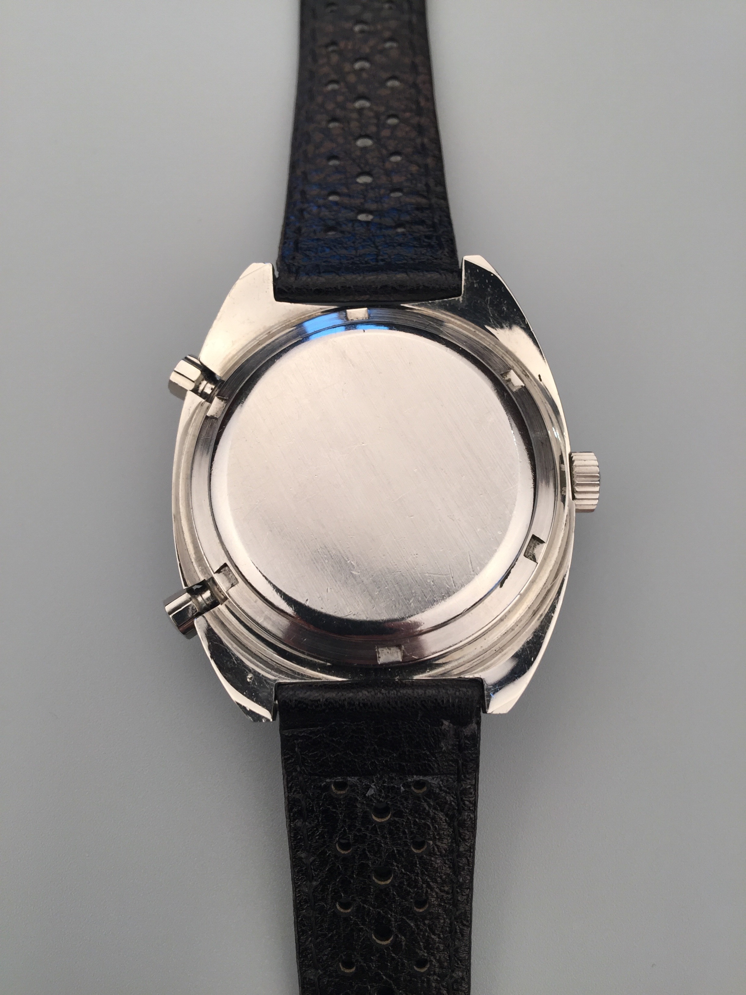 自动上链机芯,Cal.12, 铭刻SX,17石。银盘,巴顿时标,脉搏计,测速圈。钢材质外壳,旋入式底盖,旋转外圈,42mm口径,豪雅表扣。