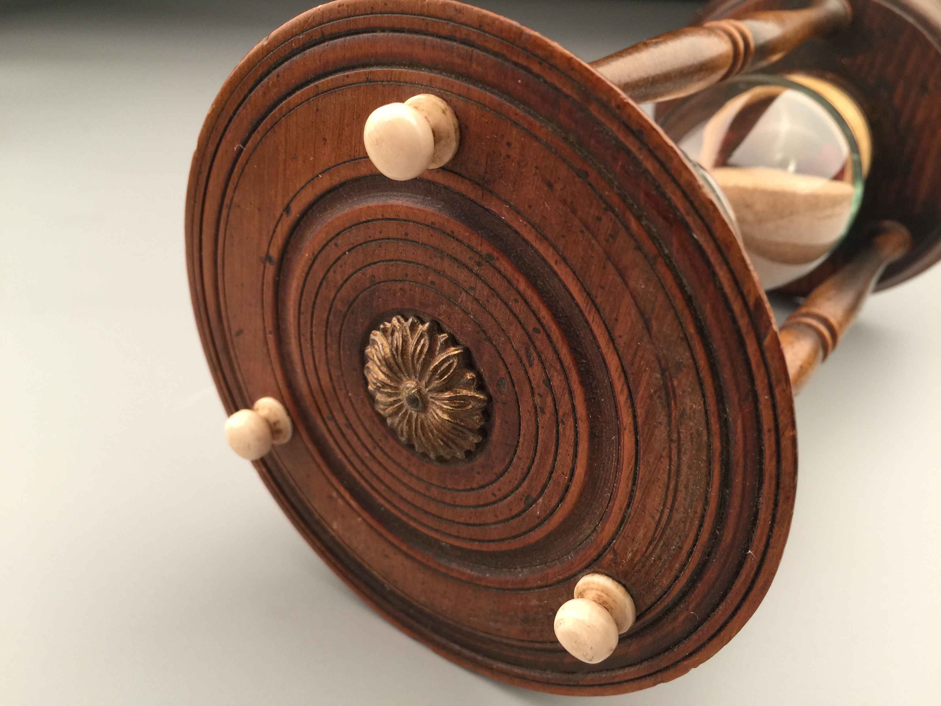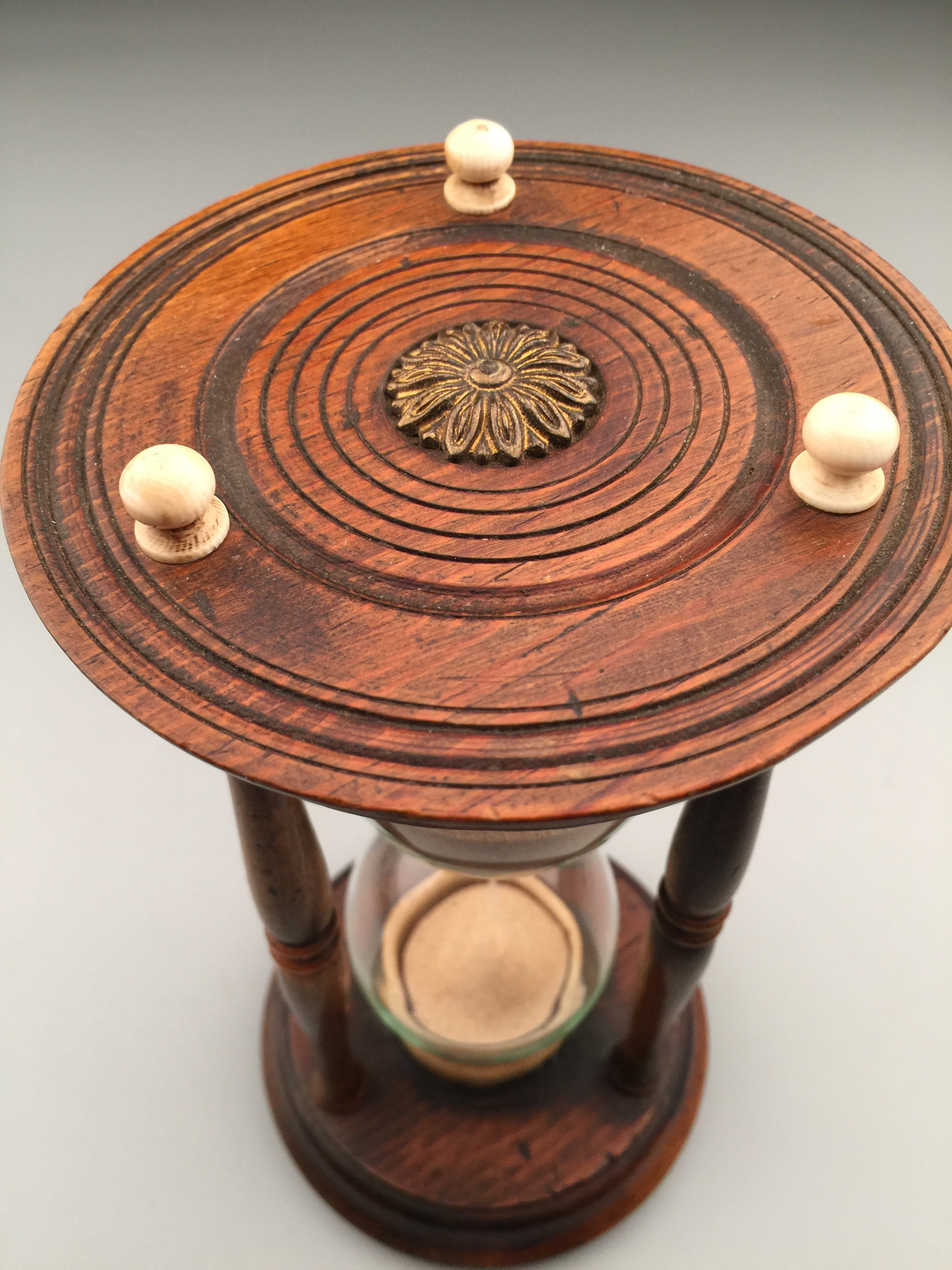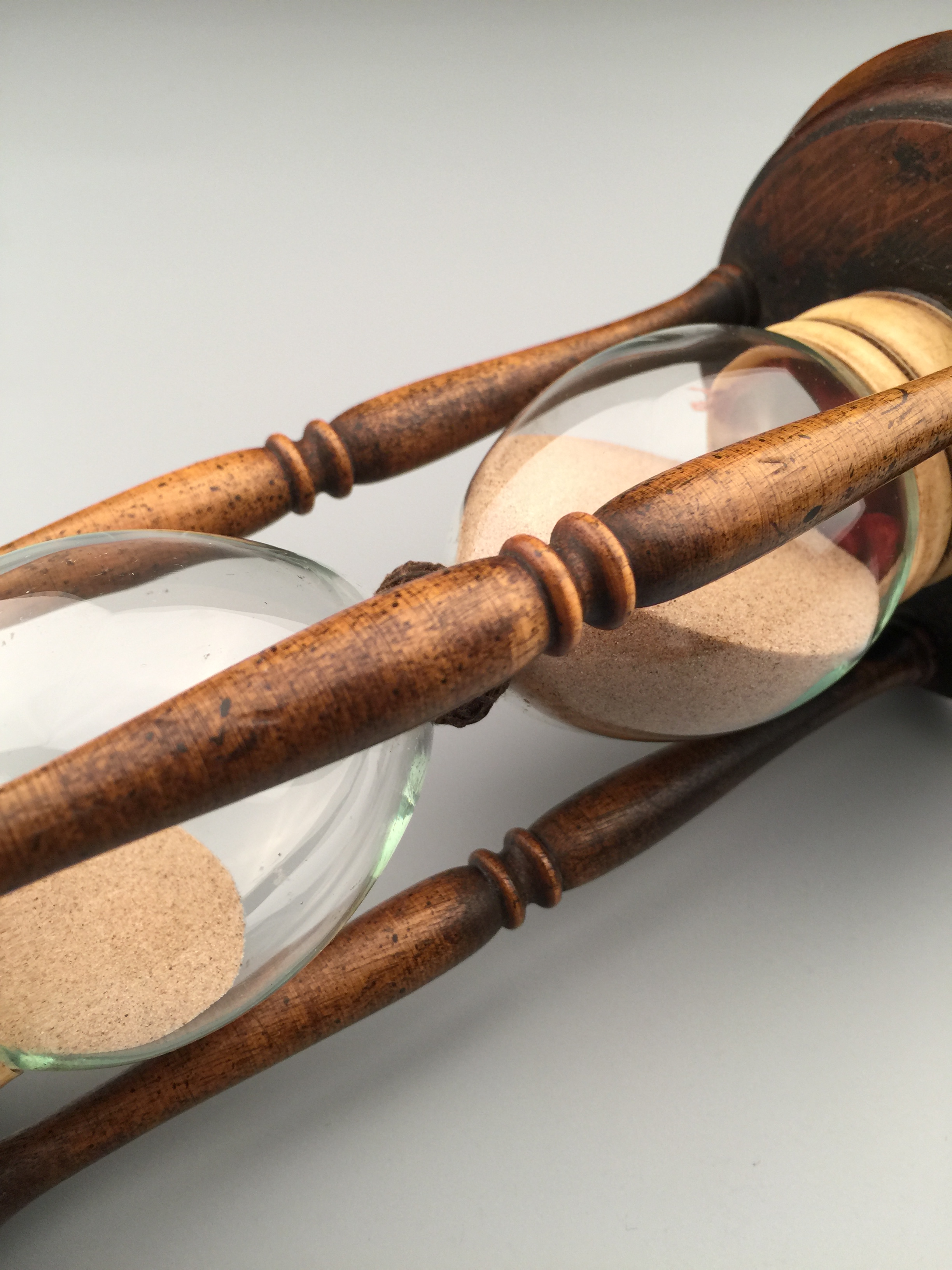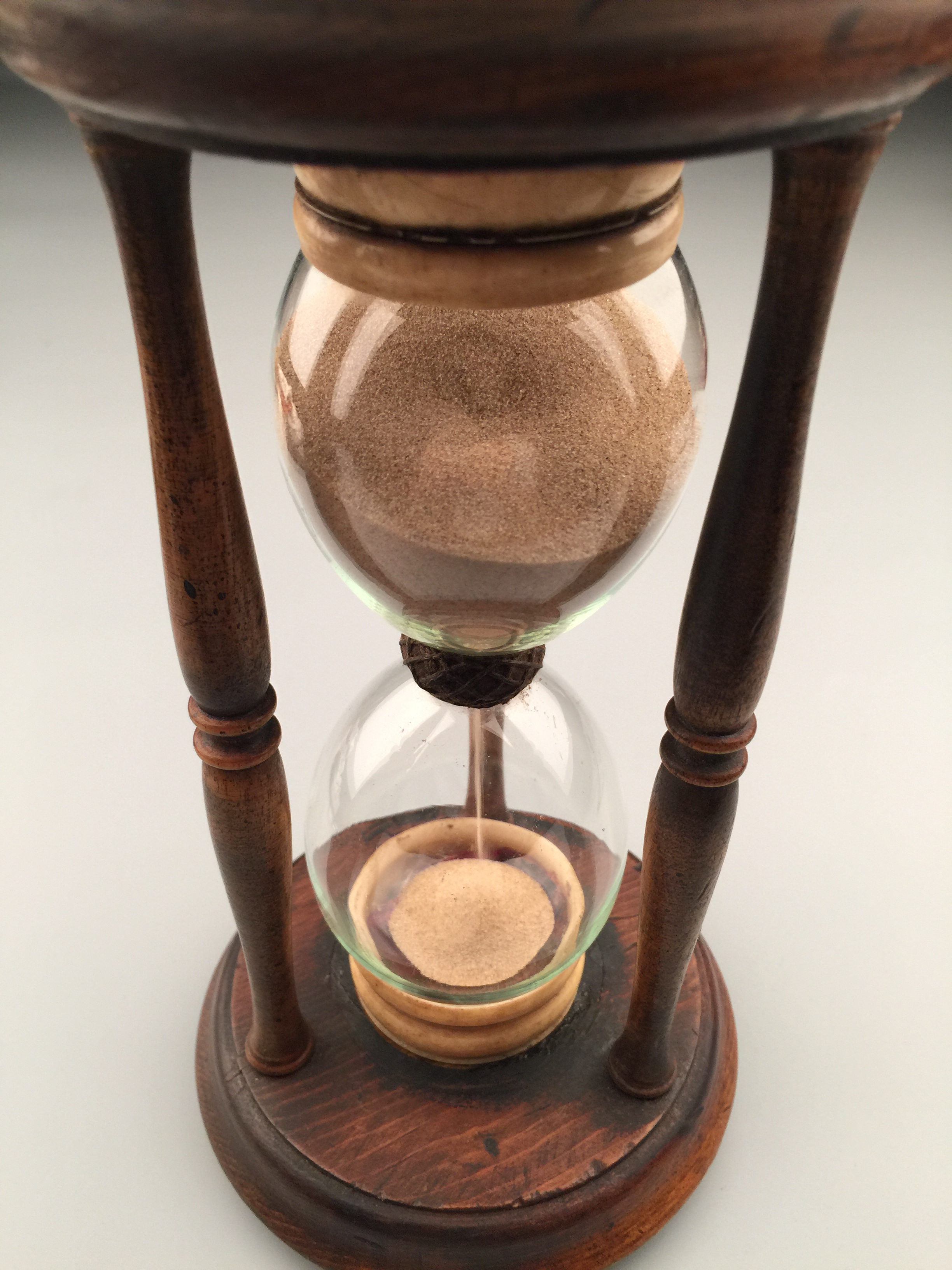 古董沙漏,22cm*11cm。沙漏也叫做沙鐘,是一種測量時間的裝置。西方沙漏由兩個玻璃球和一個狹窄的連接管道組成的。通過充滿了沙子的玻璃球從上面穿過狹窄的管道流入底部玻璃球所需要的時間來對時間進行測量。