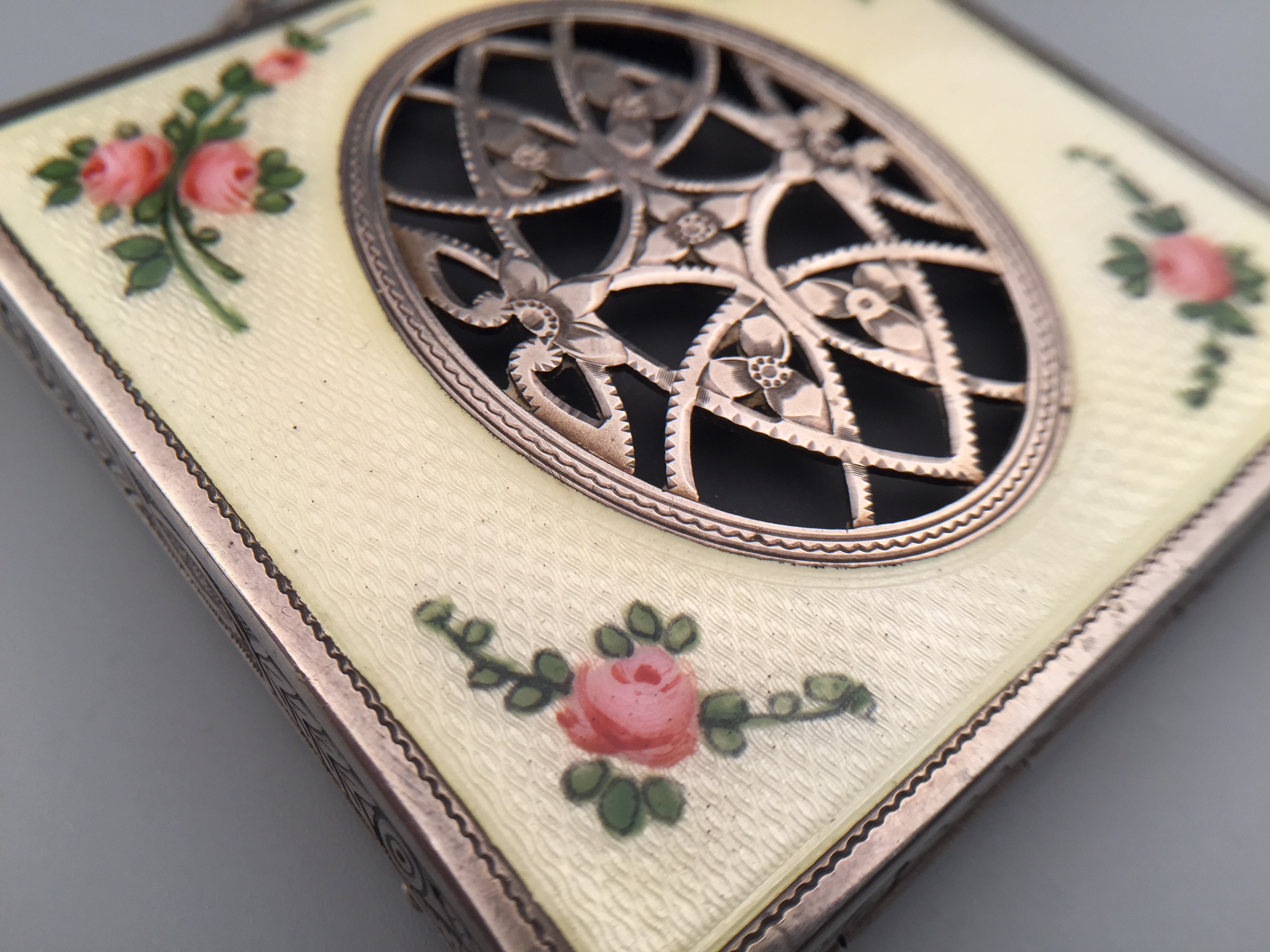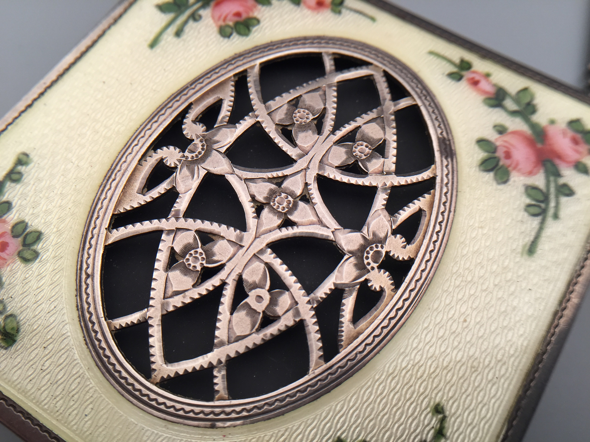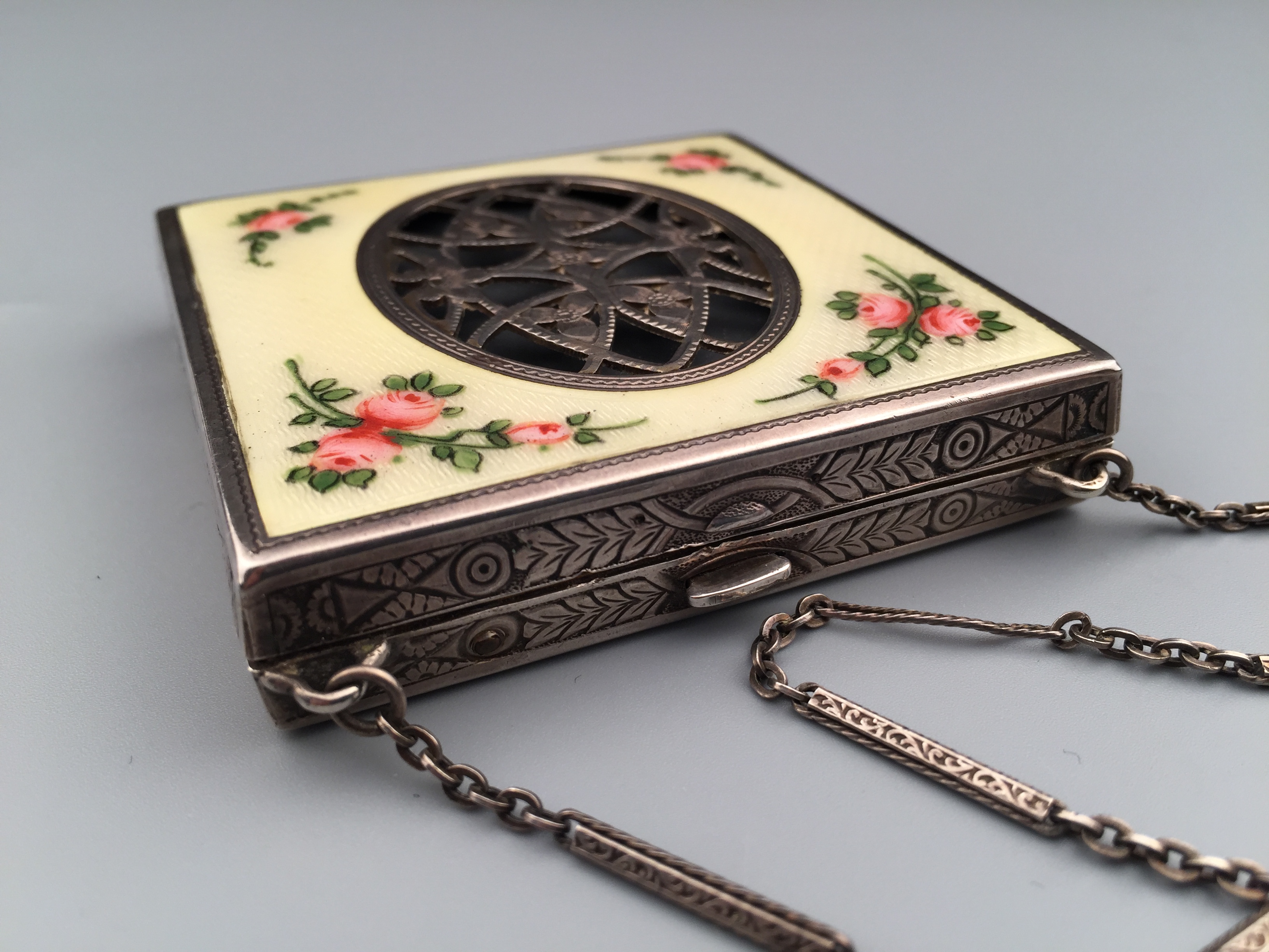 Vintage琺瑯銀材質化妝盒,淺米色琺瑯背景與四角花卉微繪圖案,橢圓形中心開窗,精美鏤空紋飾,側面以多種紋樣雕刻裝飾,附原裝鏈帶,65 * 65 *13 mm。