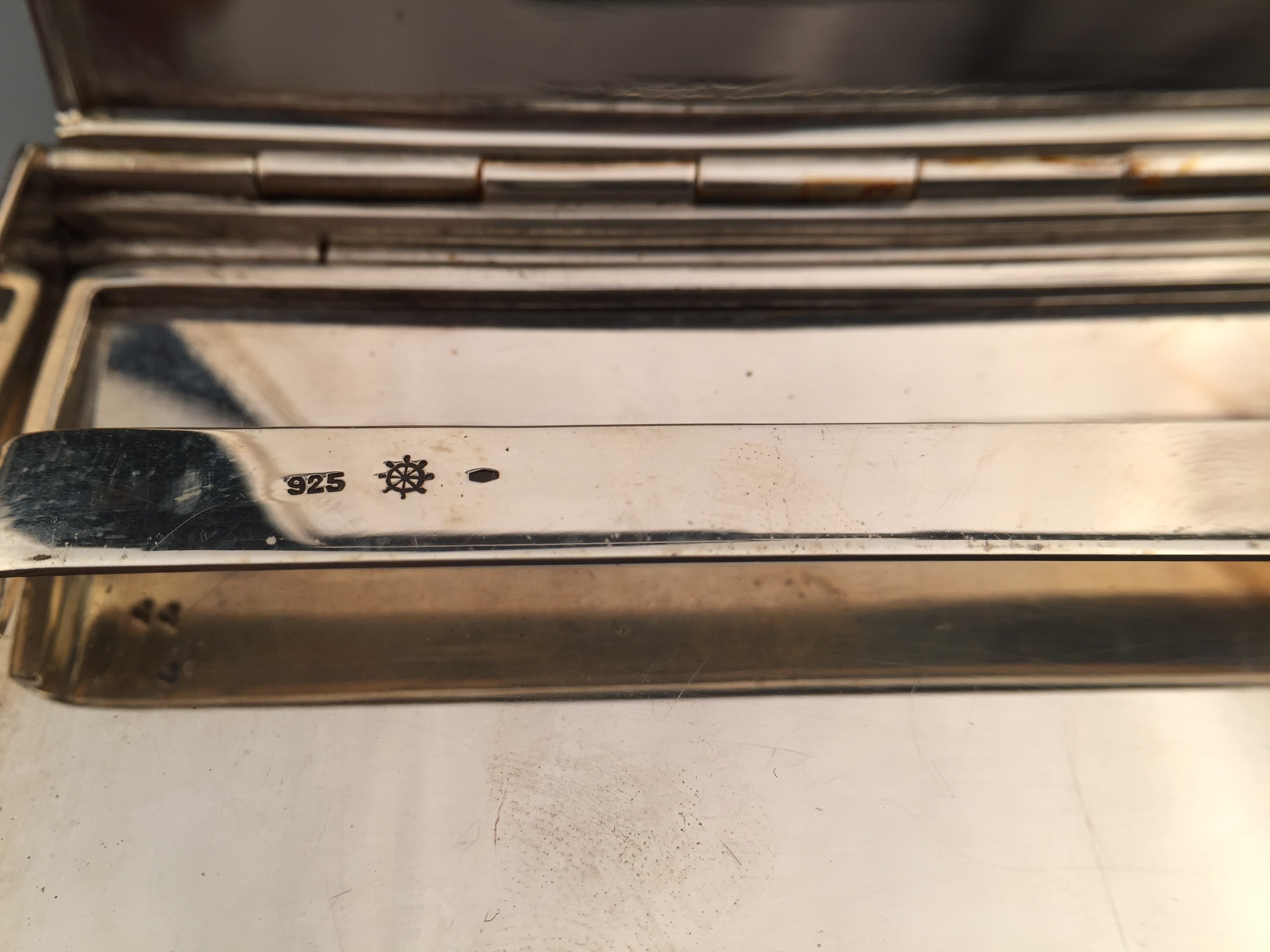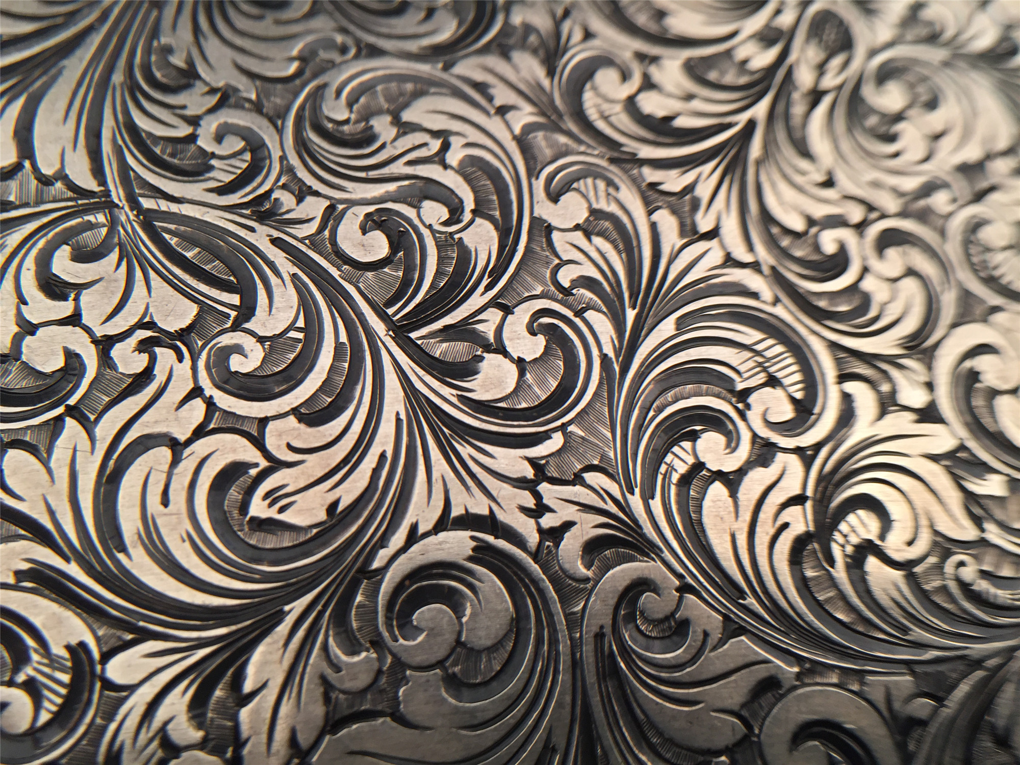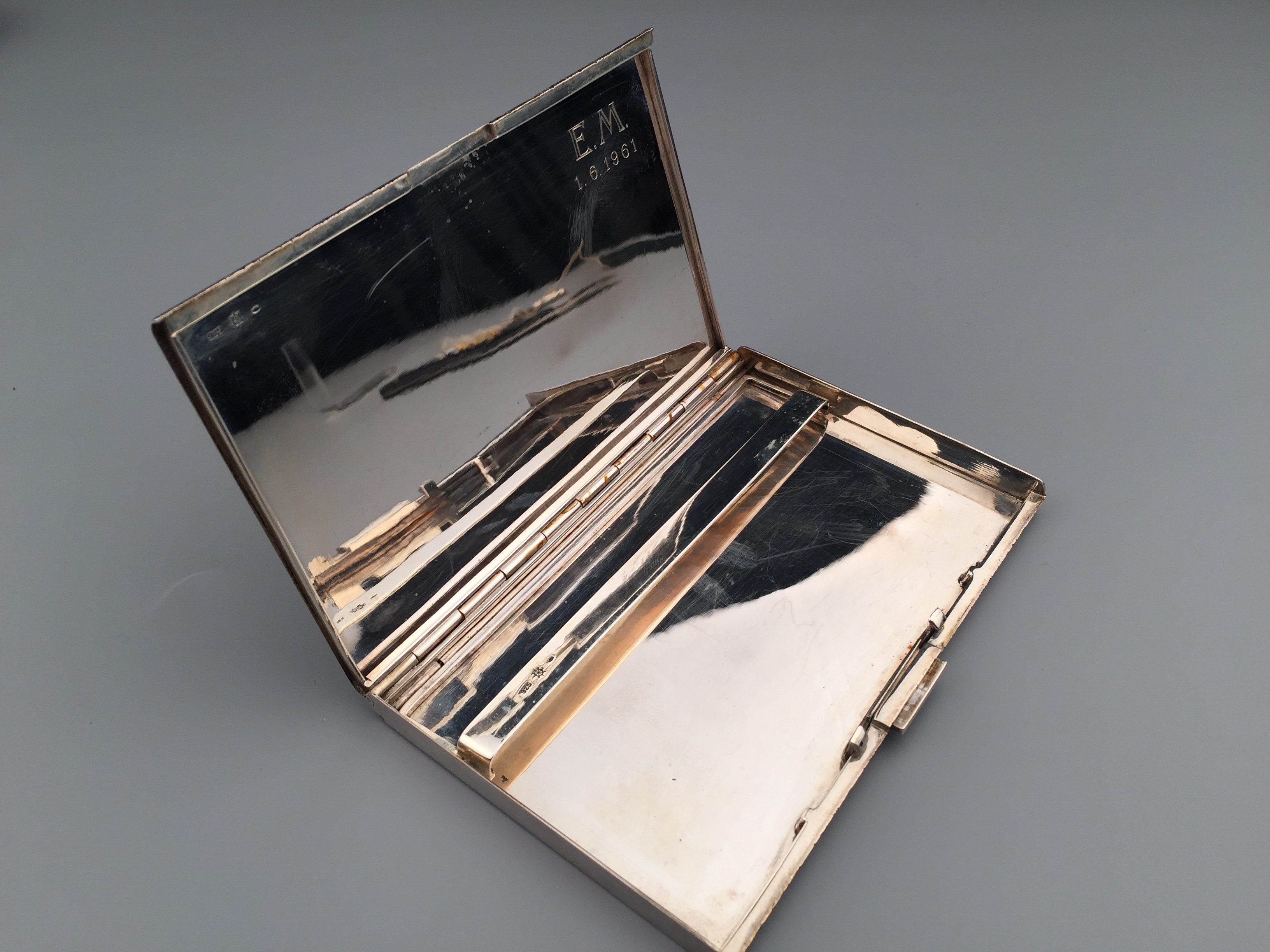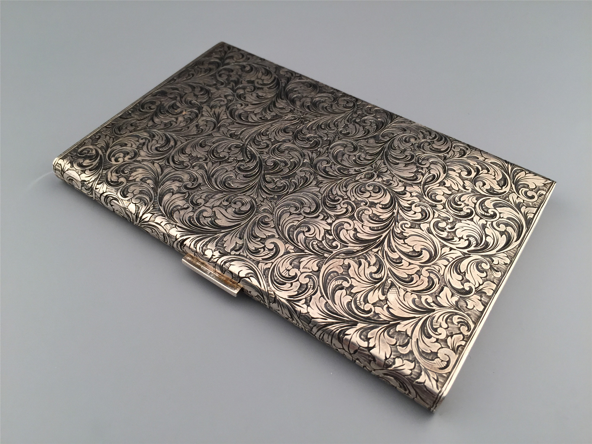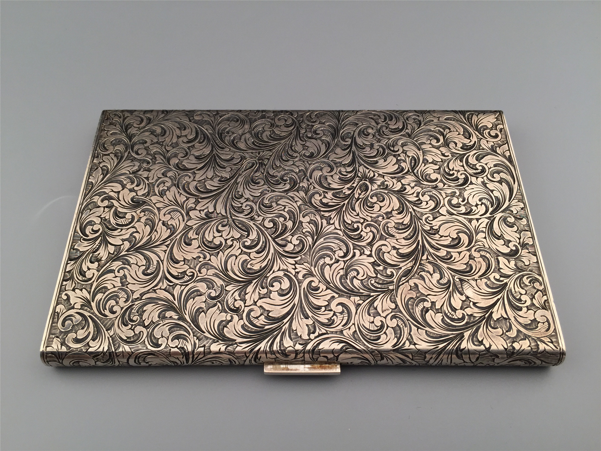 极其华美的vintage银质烟盒,外盖精致的手工雕刻纹饰,130 * 82 * 9mm,194克,铭刻“E.M.”“1.6.1961”,品相极好。