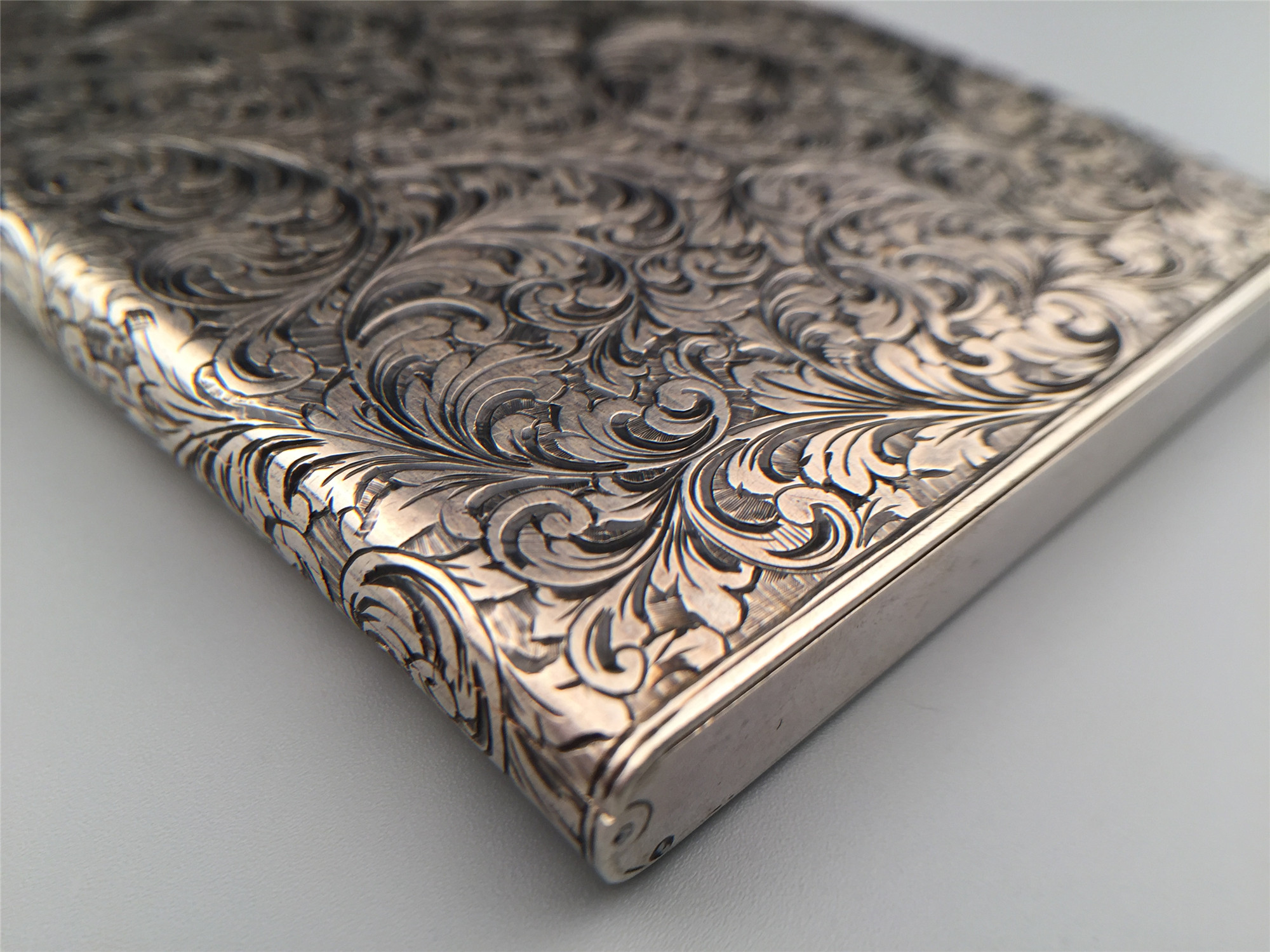 極其華美的vintage銀質煙盒,外蓋精緻的手工雕刻紋飾,130 * 82 * 9mm,194克,銘刻“E.M.”“1.6.1961”,品相極好。