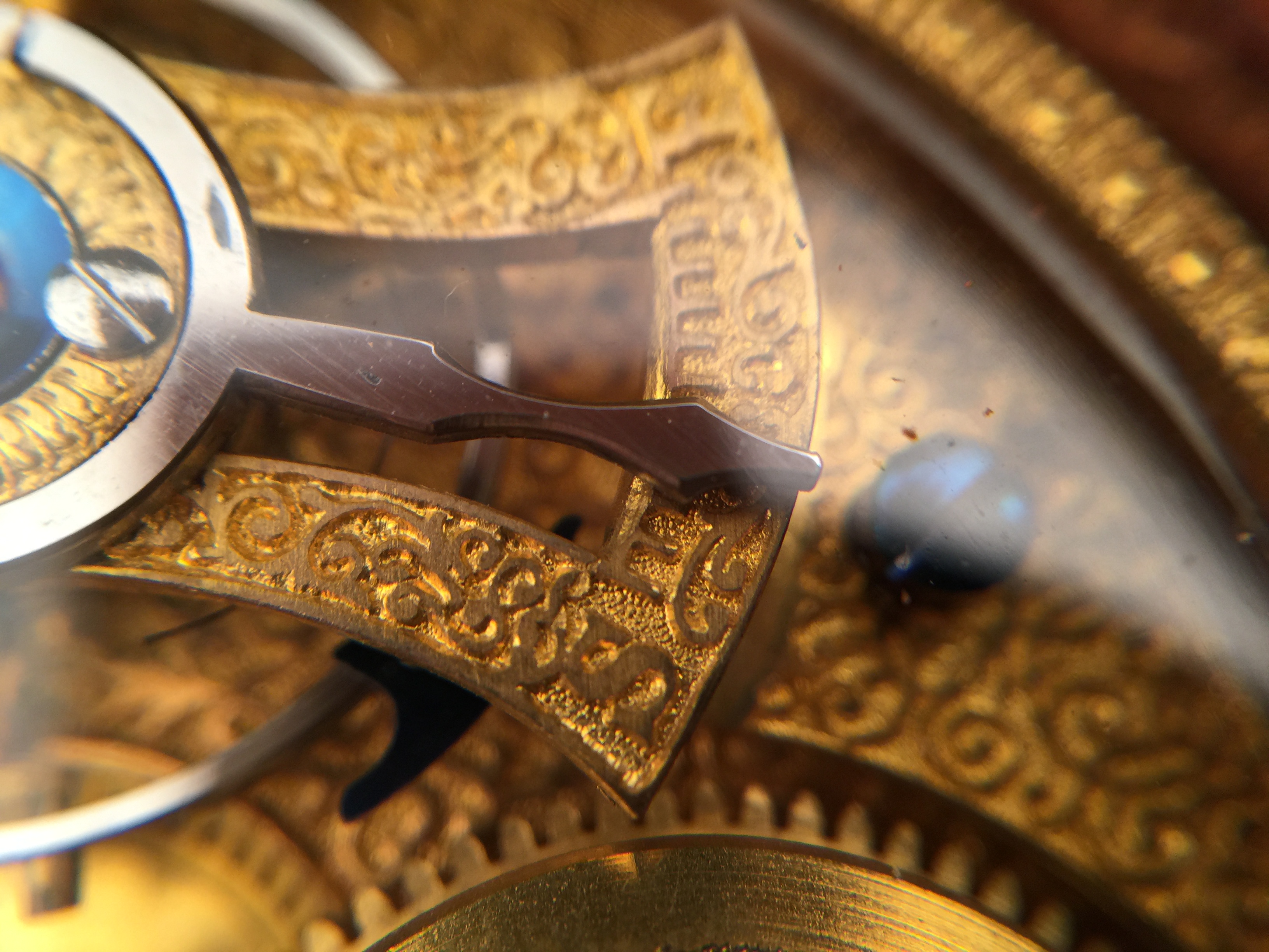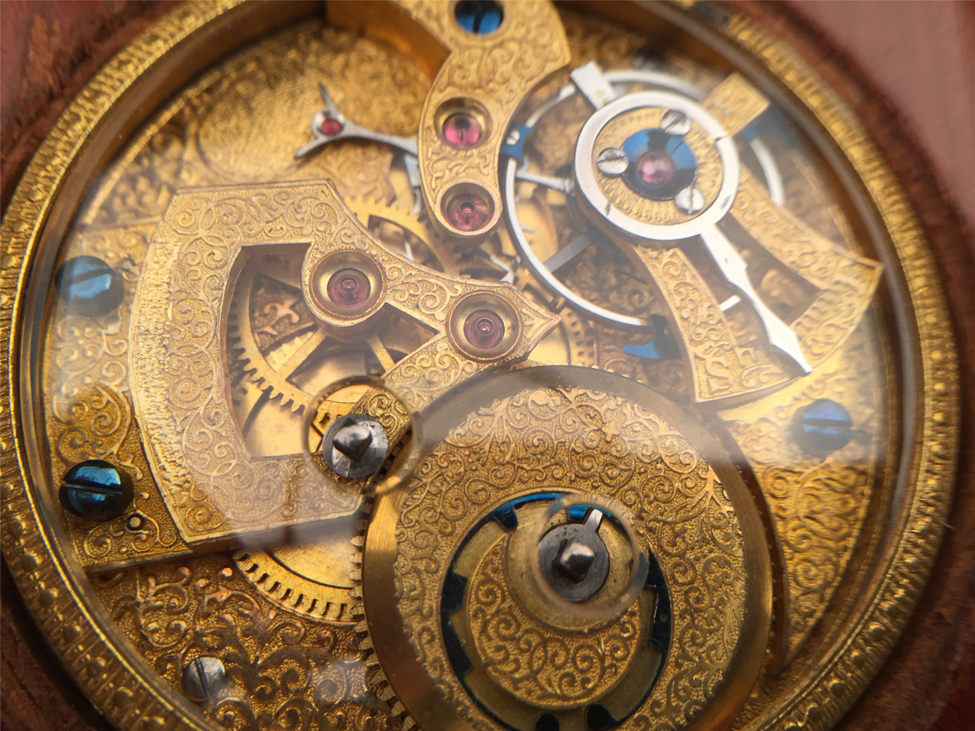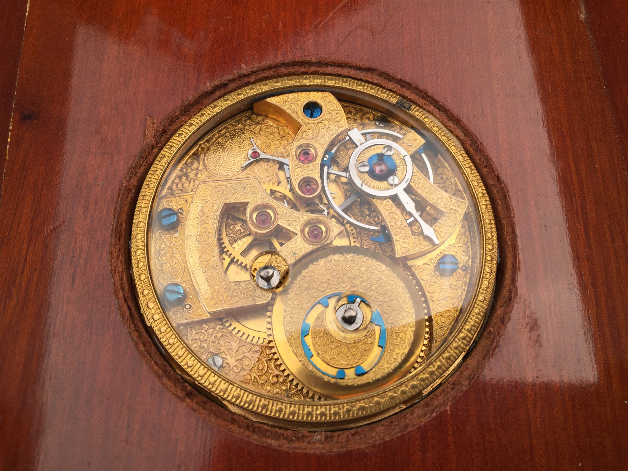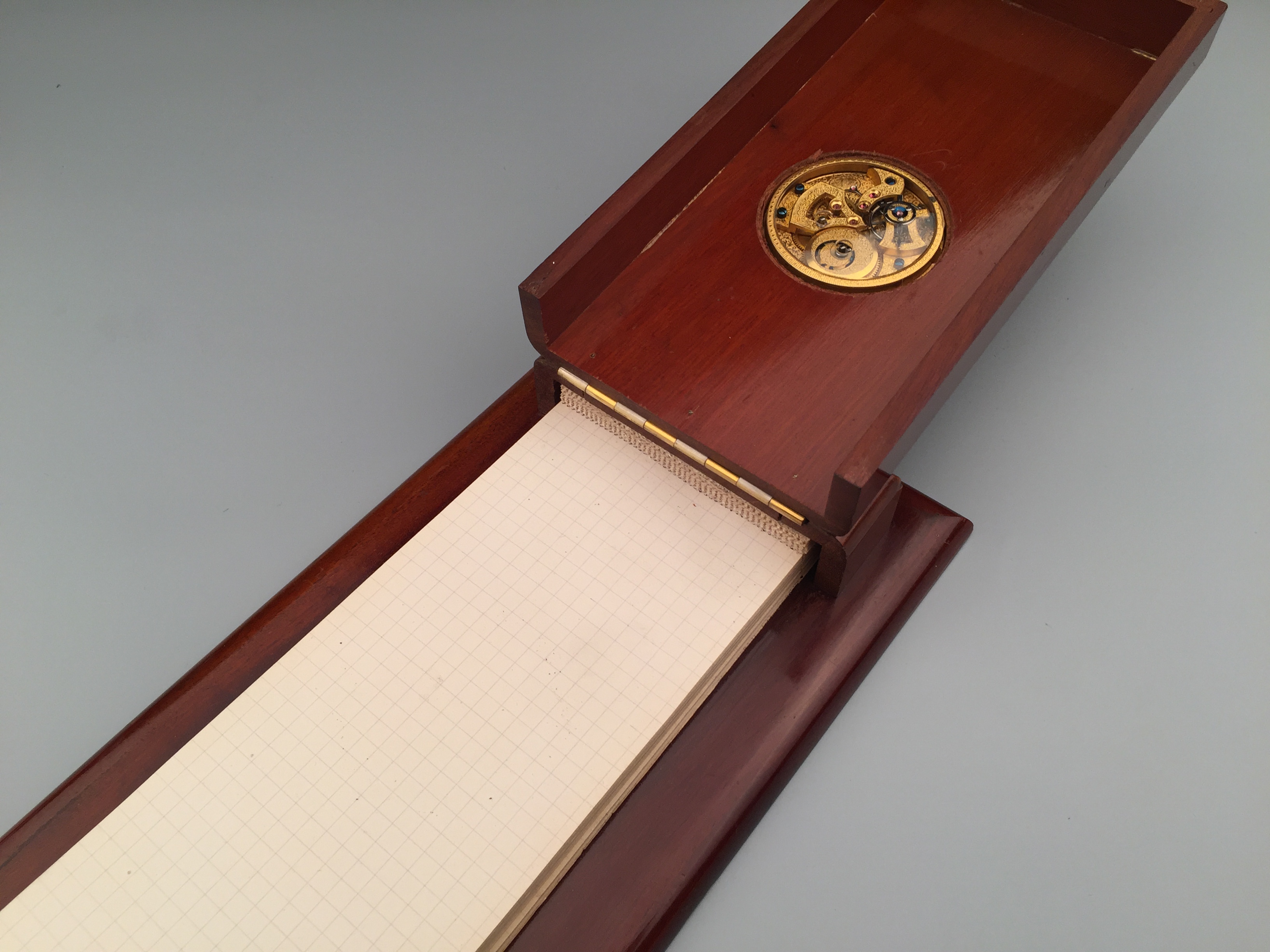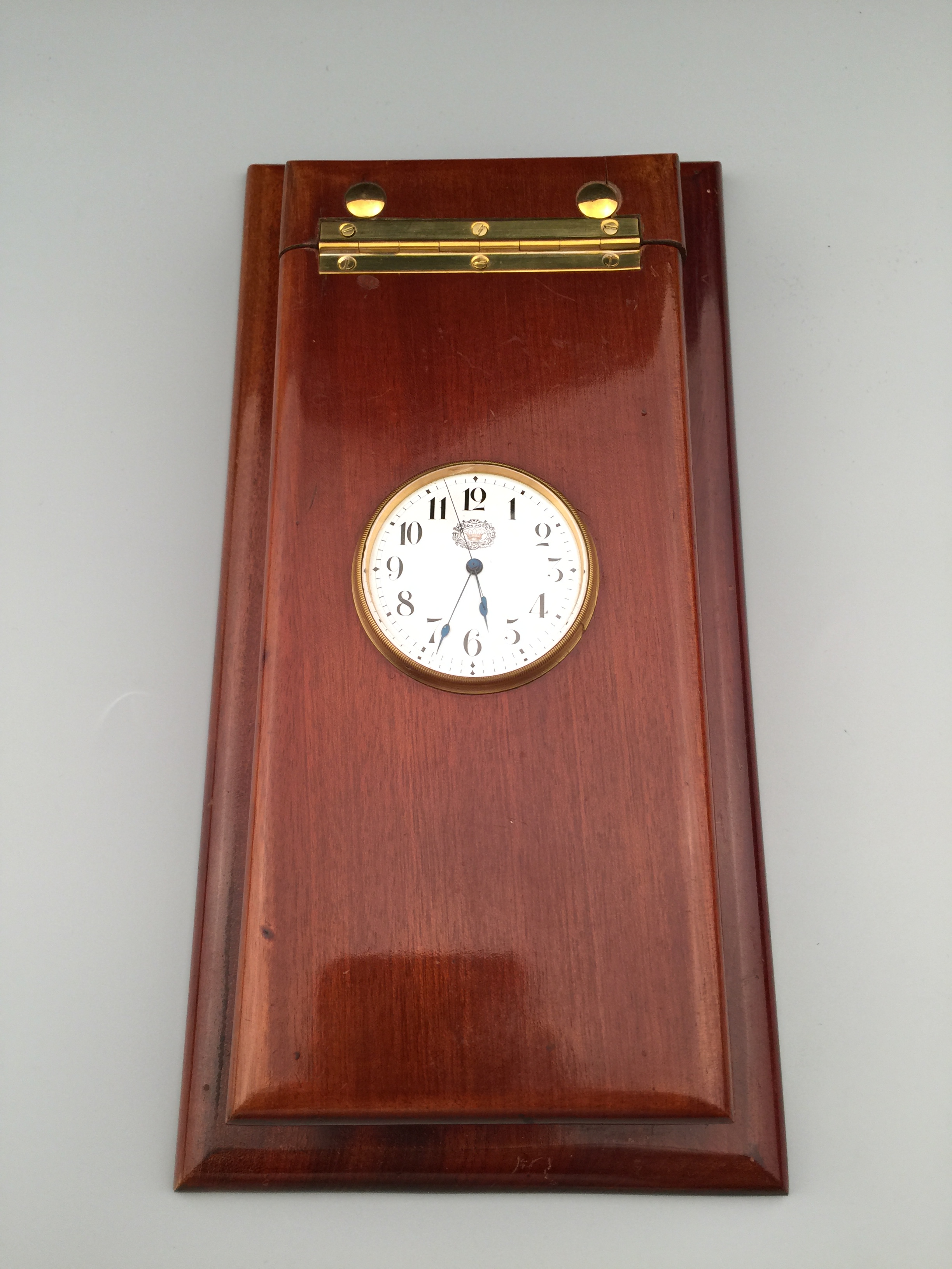 极其罕见和稀有的古董特殊定制桌上时计,附木质外盒,27 * 13 * 3.5 cm,将一枚中国市场表镶嵌其中,白色珐琅盘面,阿拉伯数字,中心指针,12点位皇冠纹样,内附便签纸。