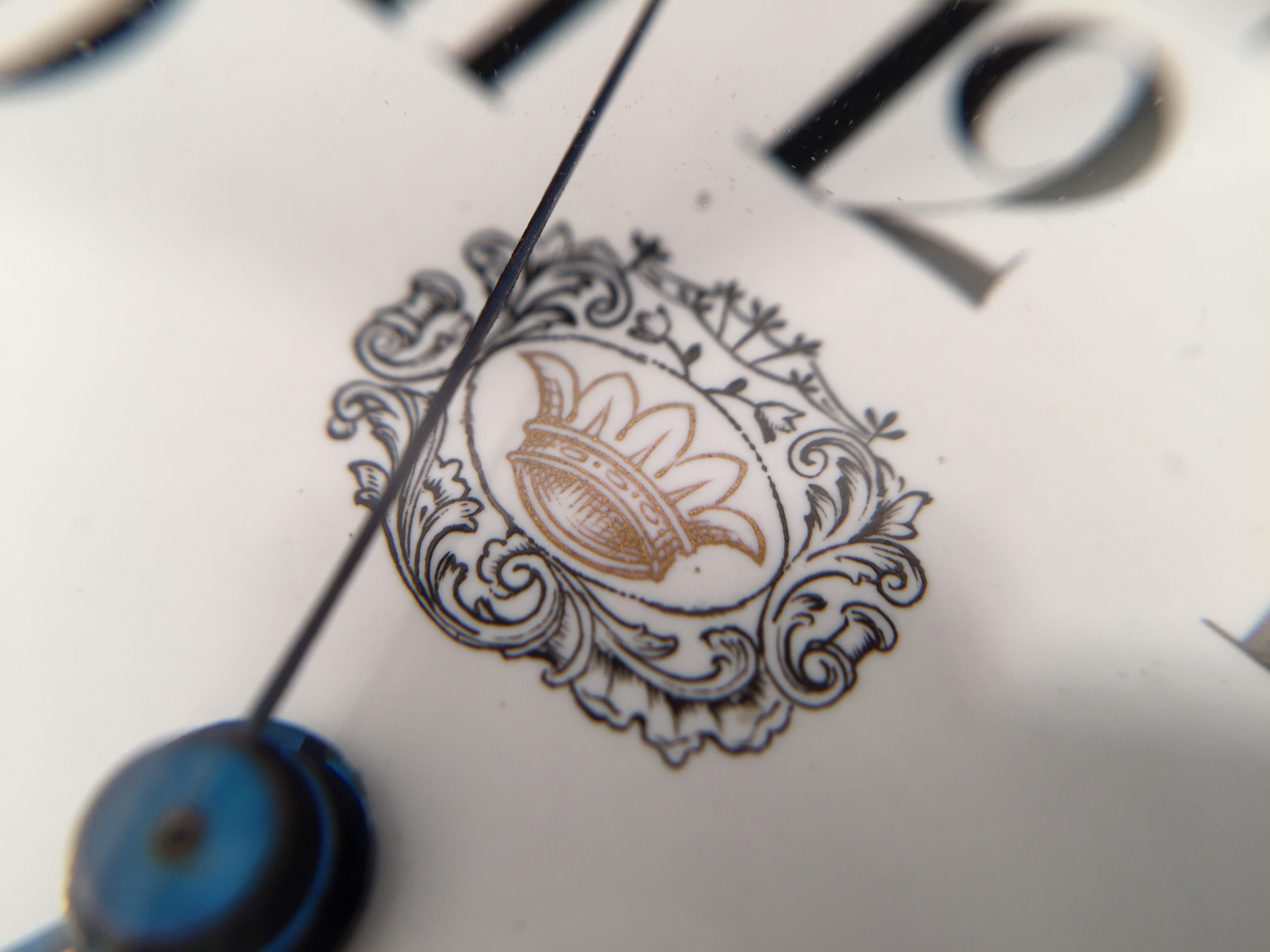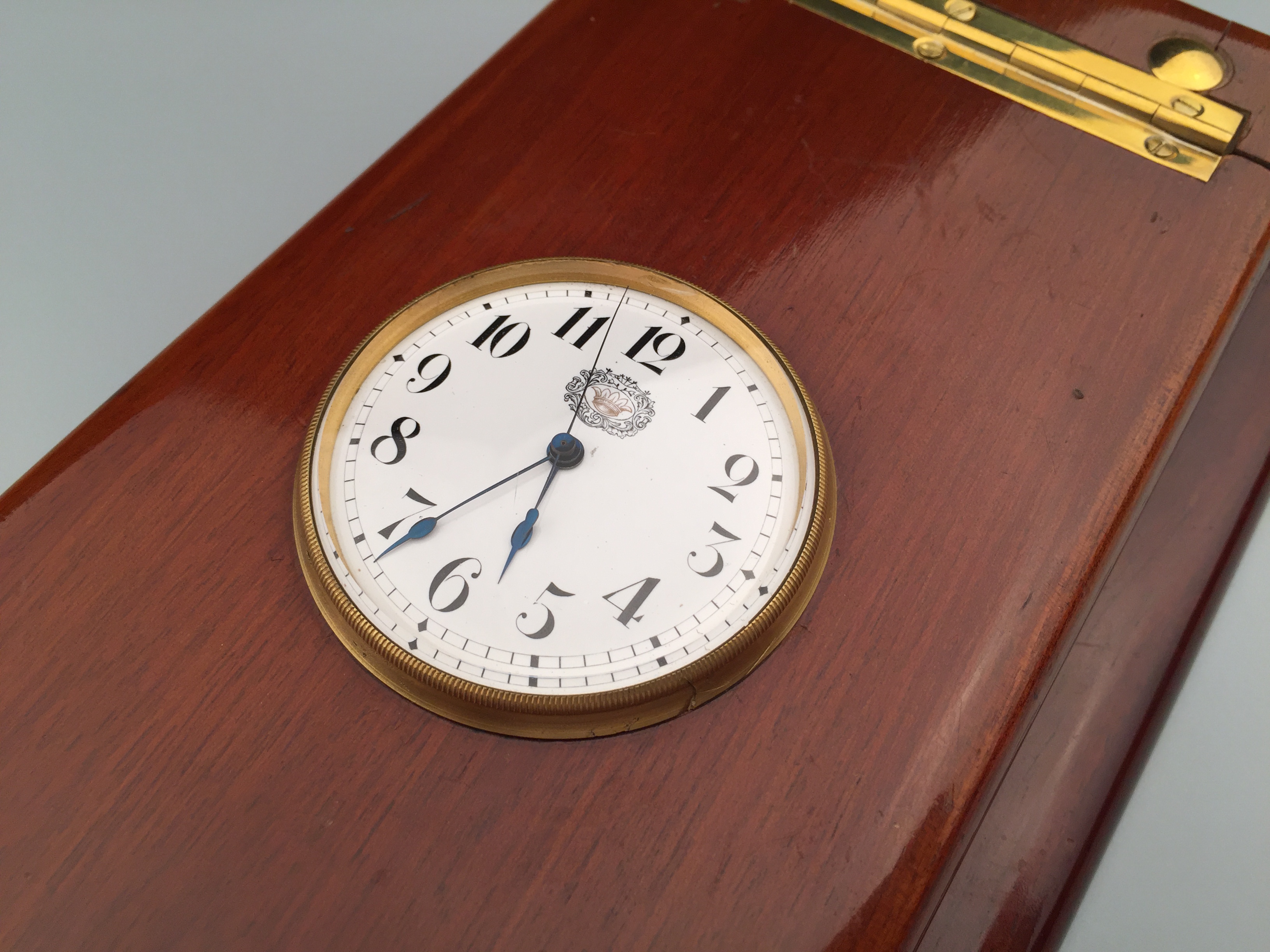 極其罕見和稀有的古董特殊定制桌上時計,附木質外盒,27 * 13 * 3.5 cm,將一枚中國市場表鑲嵌其中,白色琺瑯盤面,阿拉伯數字,中心指針,12點位皇冠紋樣,內附便簽紙。