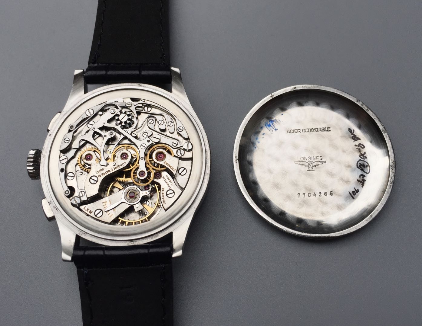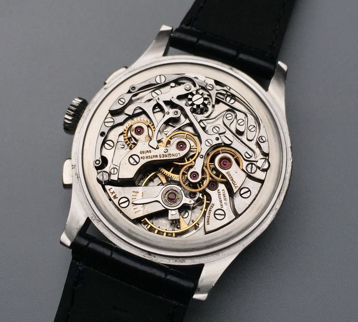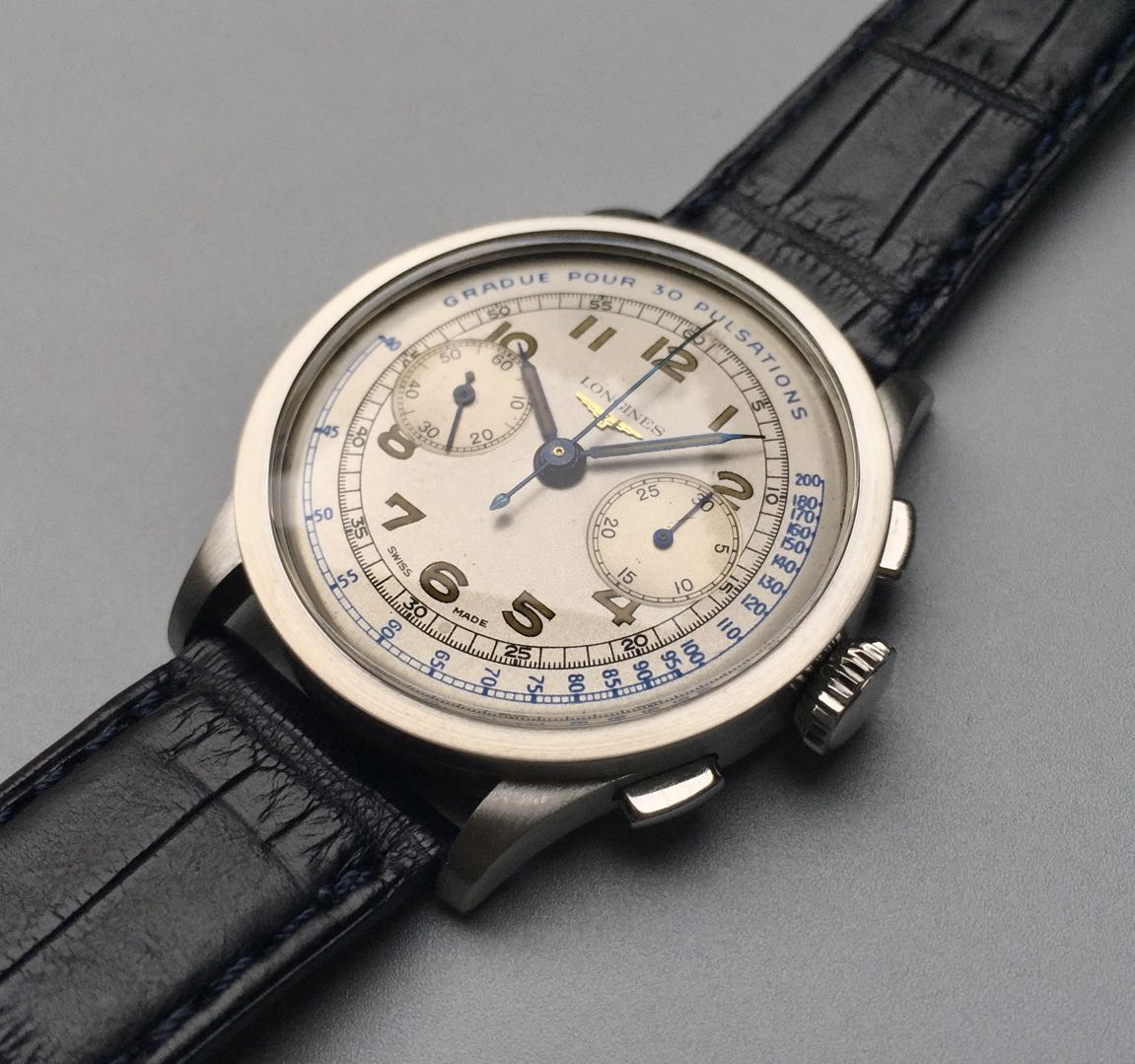 浪琴vintage计时表,钢材质,双色Telephone dial,脉搏计,30分钟计时盘。
