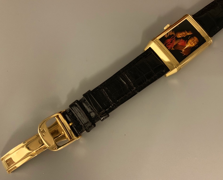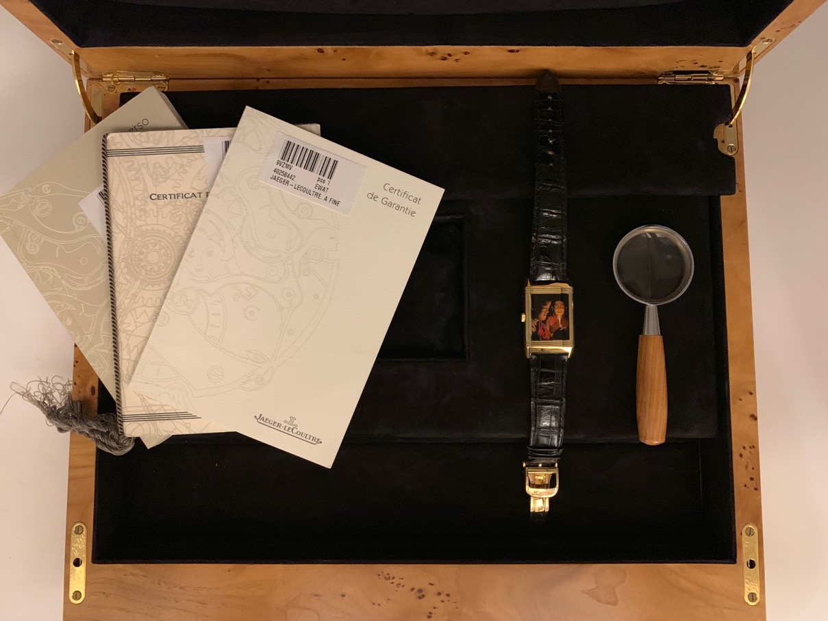 积家Jaeger-LeCoultre翻转腕表Reverso,限量版,微绘珐琅“真理之路“,铭刻限量编号No.3/8,约2010年。黄金材质,宽26mm,原装积家折叠表扣,附证书、表盒、手册,品相如新。