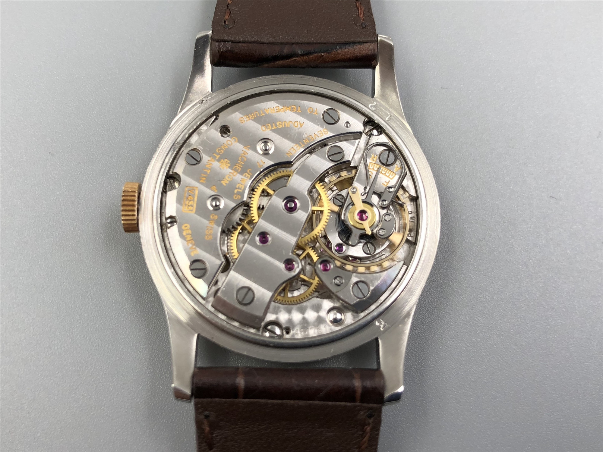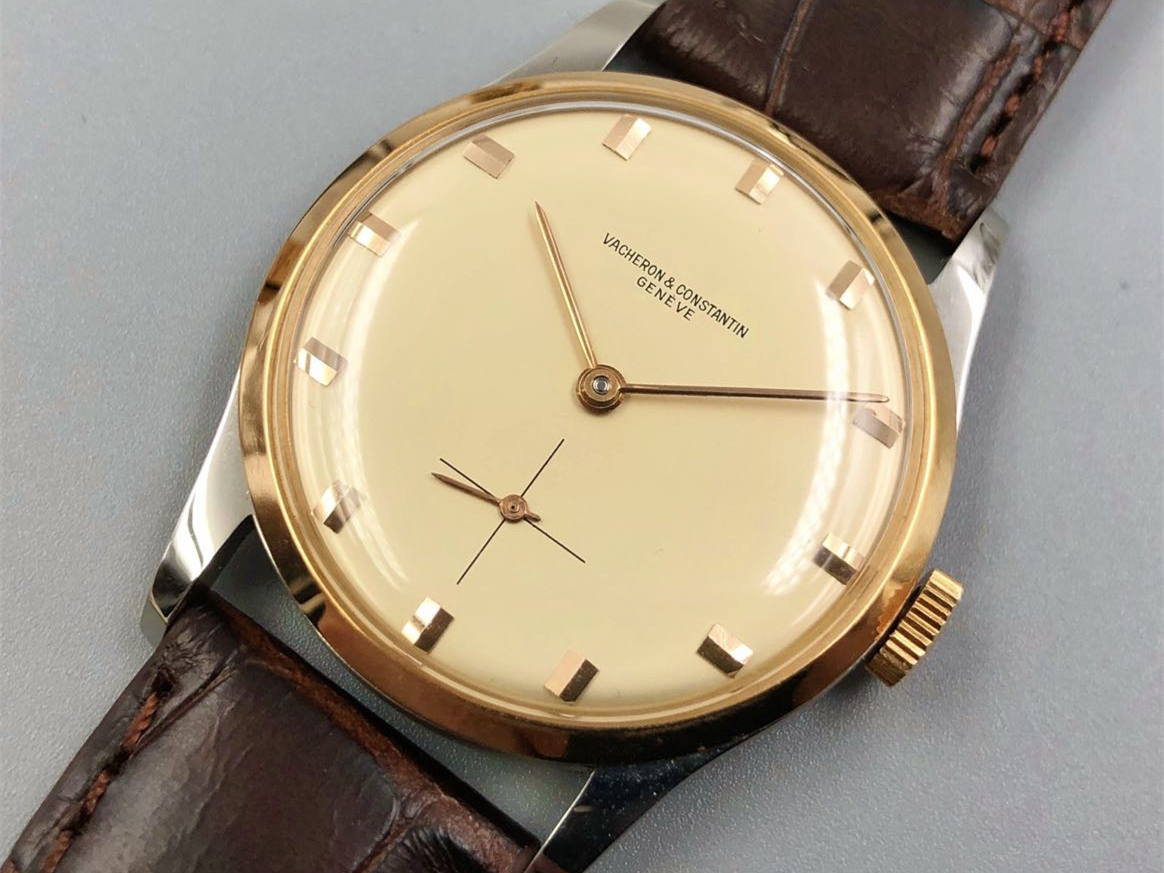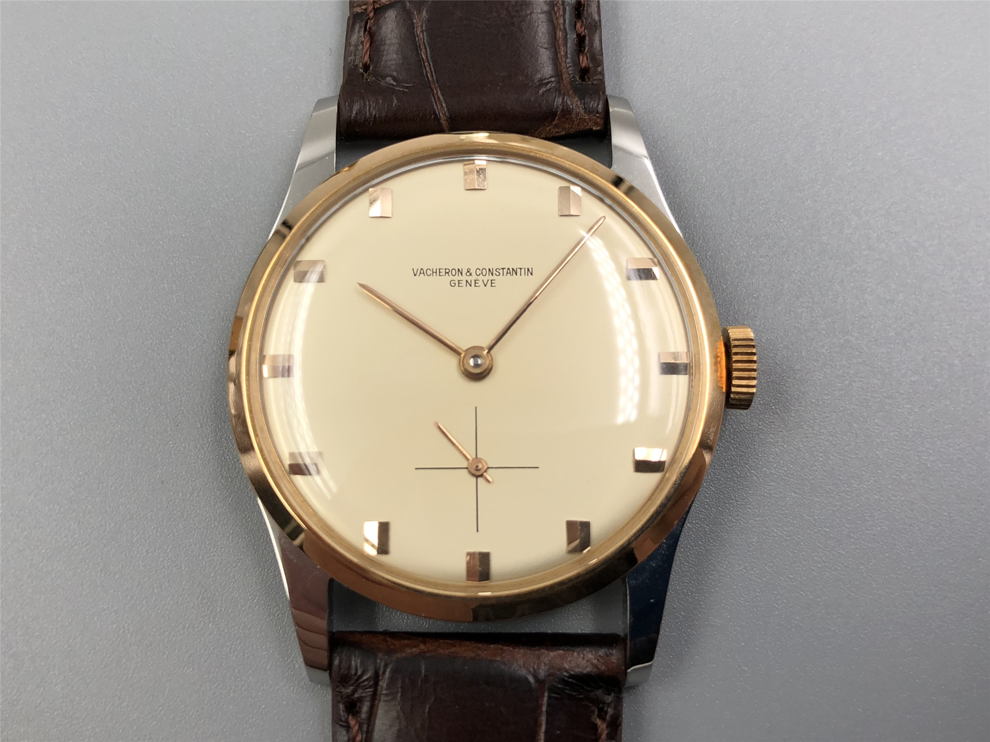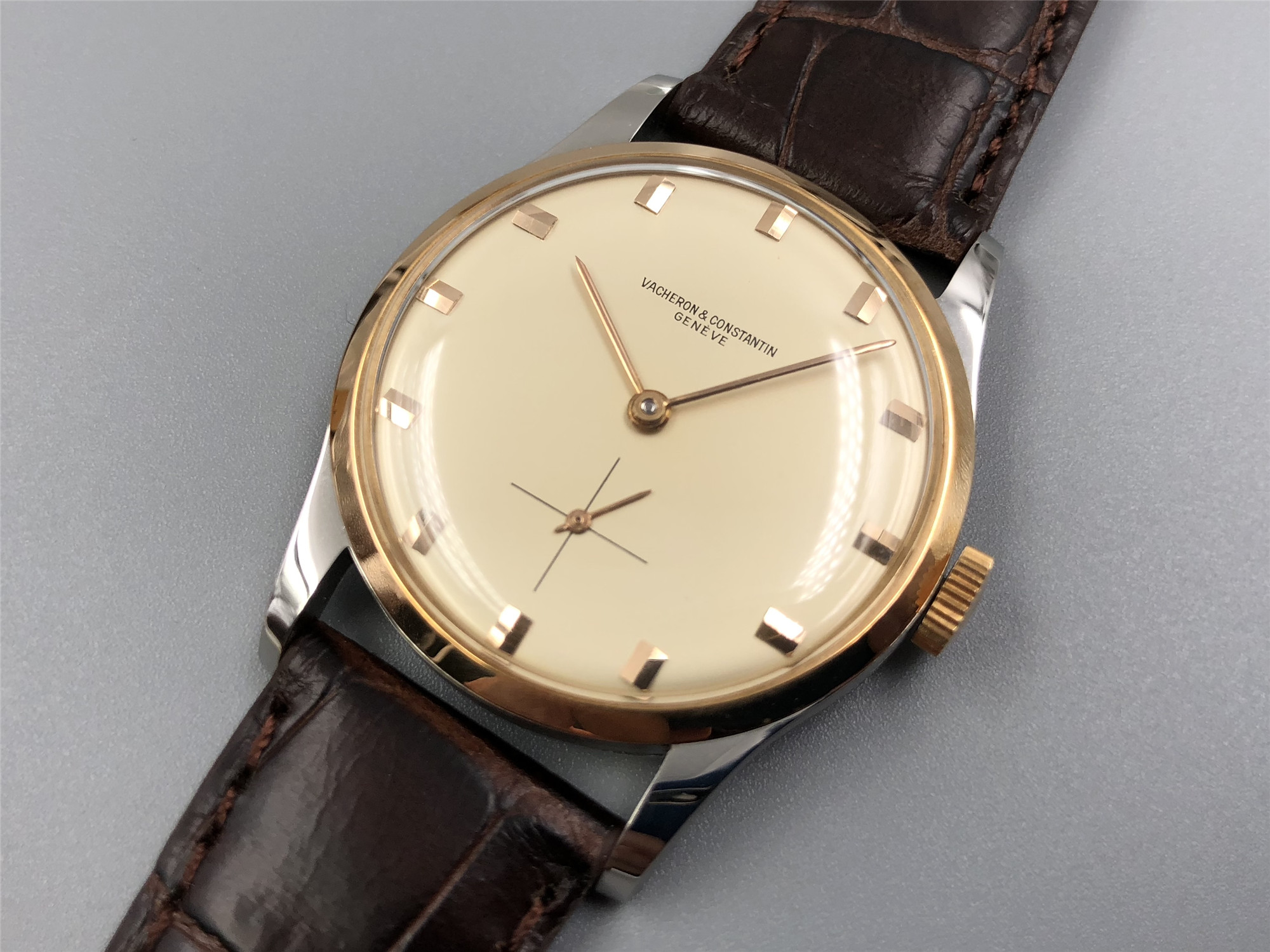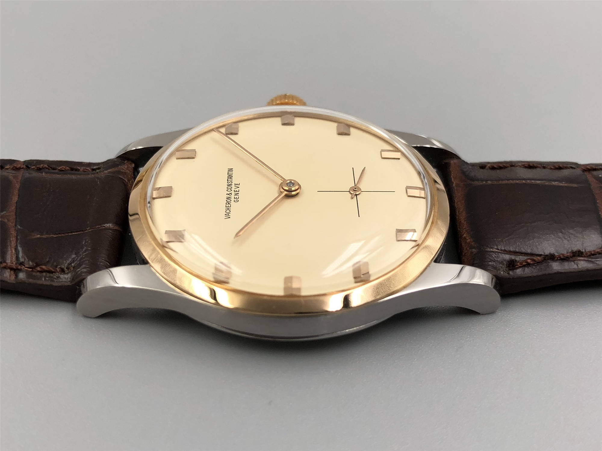 江诗丹顿腕表,约1945年。钢材质表壳,红金表圈、时标、指针和表冠,按压式底盖。手动上链机芯V453,17石,温度调整。银盘,方形斜面时标,巴顿指针,小秒针,外圈分钟刻度。表壳、盘面和机芯签名。典型的1940/1950年代风格,罕见的双色表壳和特殊盘面,简洁又极具个性,设计感十足。在70年后的今天看来,仍然是极佳的日内瓦高级制表作品,表壳锋利,机芯干净,上链顺滑,品相如新。