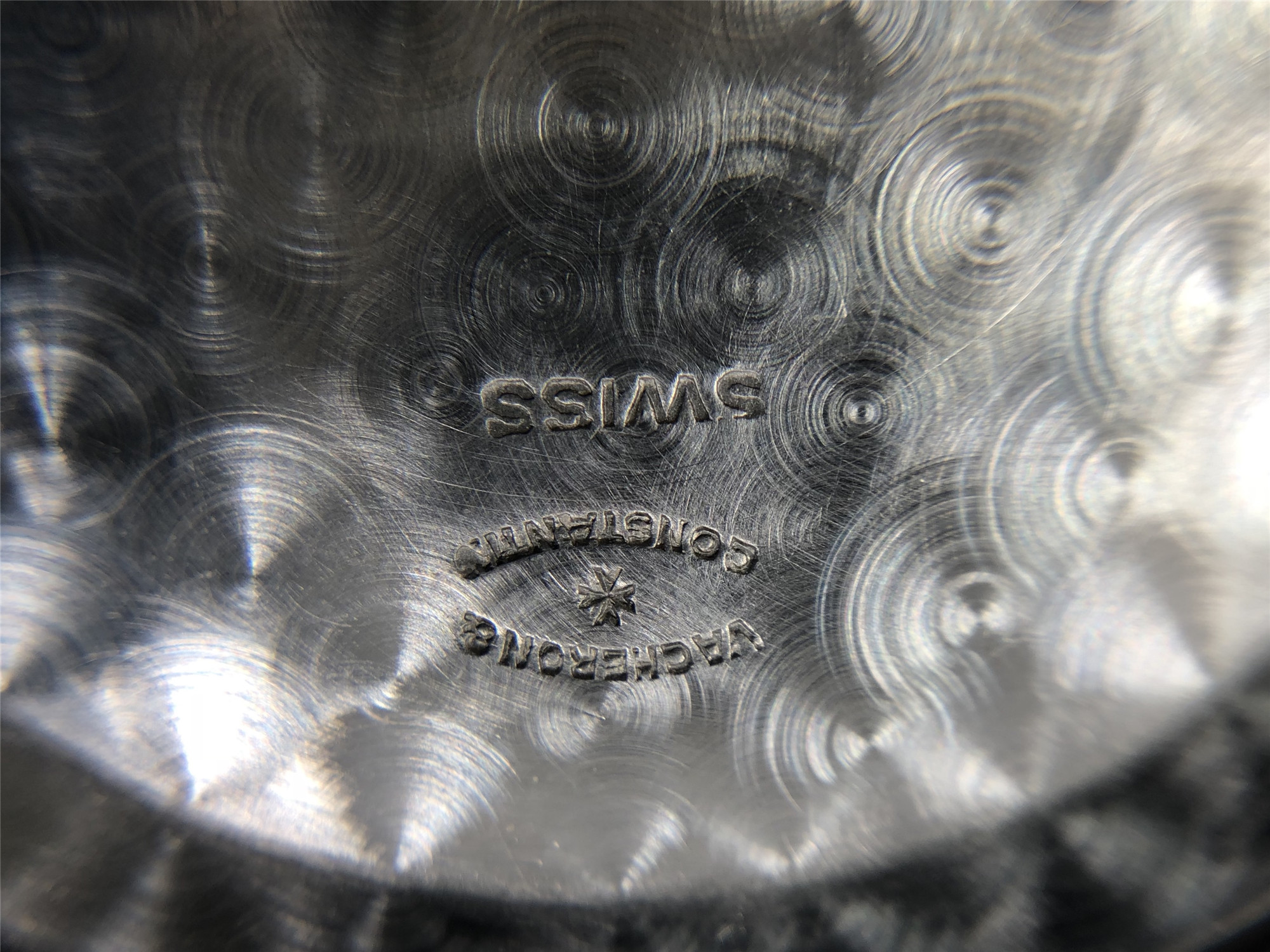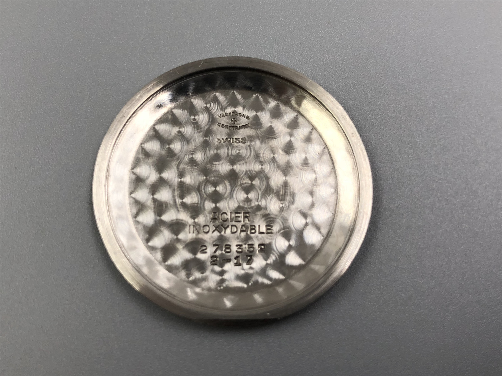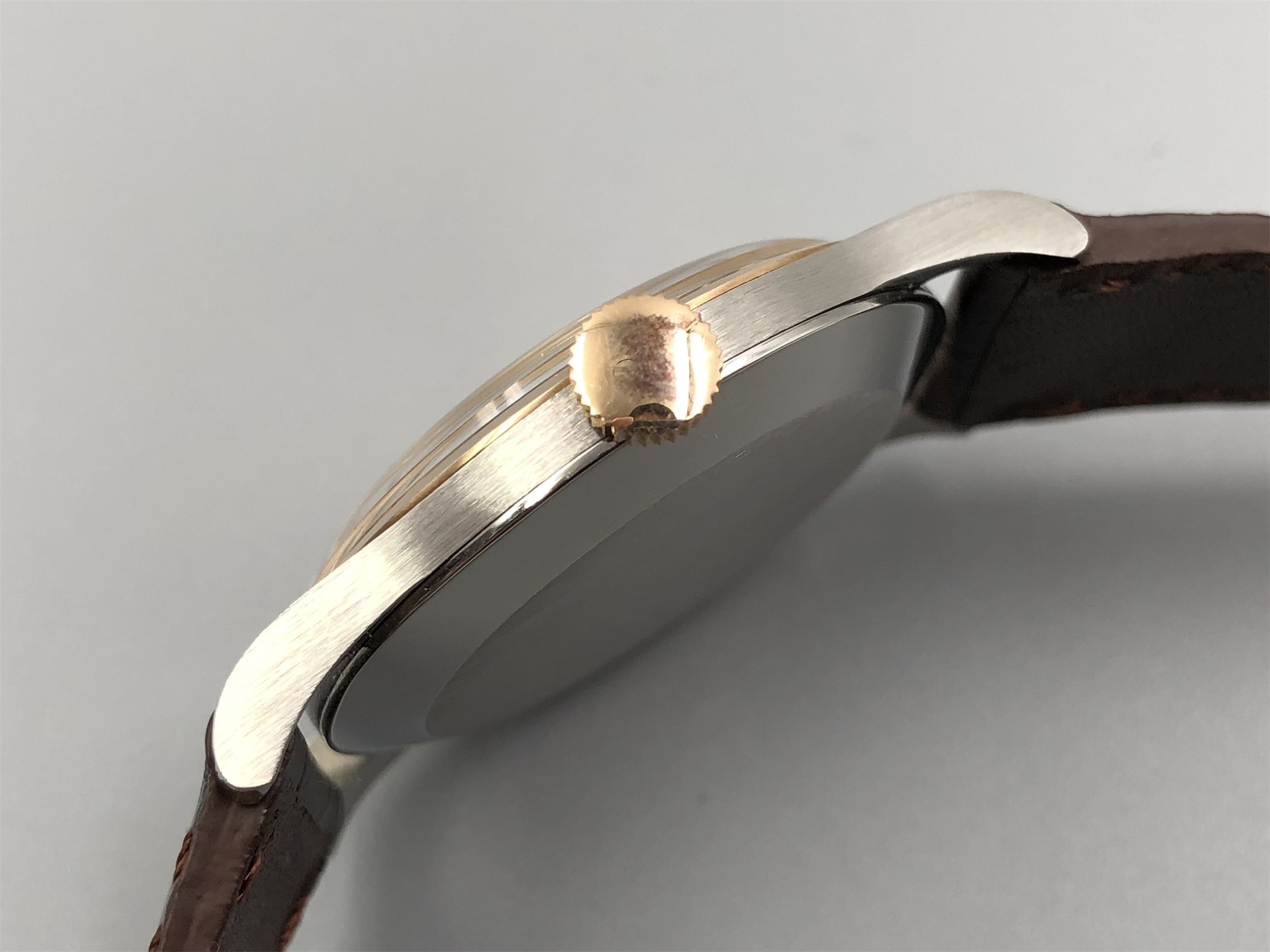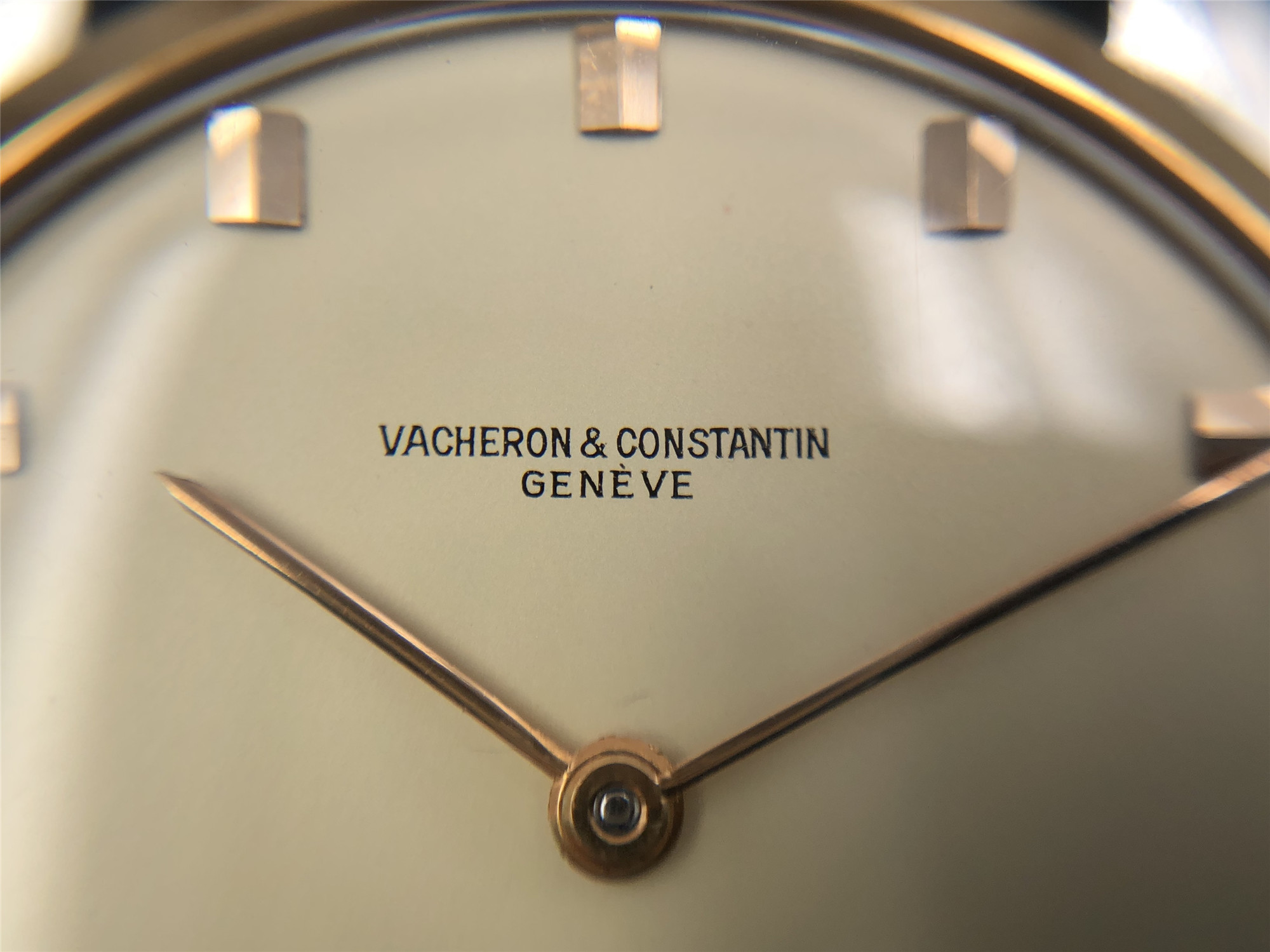 江诗丹顿腕表,约1945年。钢材质表壳,红金表圈、时标、指针和表冠,按压式底盖。手动上链机芯V453,17石,温度调整。银盘,方形斜面时标,巴顿指针,小秒针,外圈分钟刻度。表壳、盘面和机芯签名。典型的1940/1950年代风格,罕见的双色表壳和特殊盘面,简洁又极具个性,设计感十足。在70年后的今天看来,仍然是极佳的日内瓦高级制表作品,表壳锋利,机芯干净,上链顺滑,品相如新。