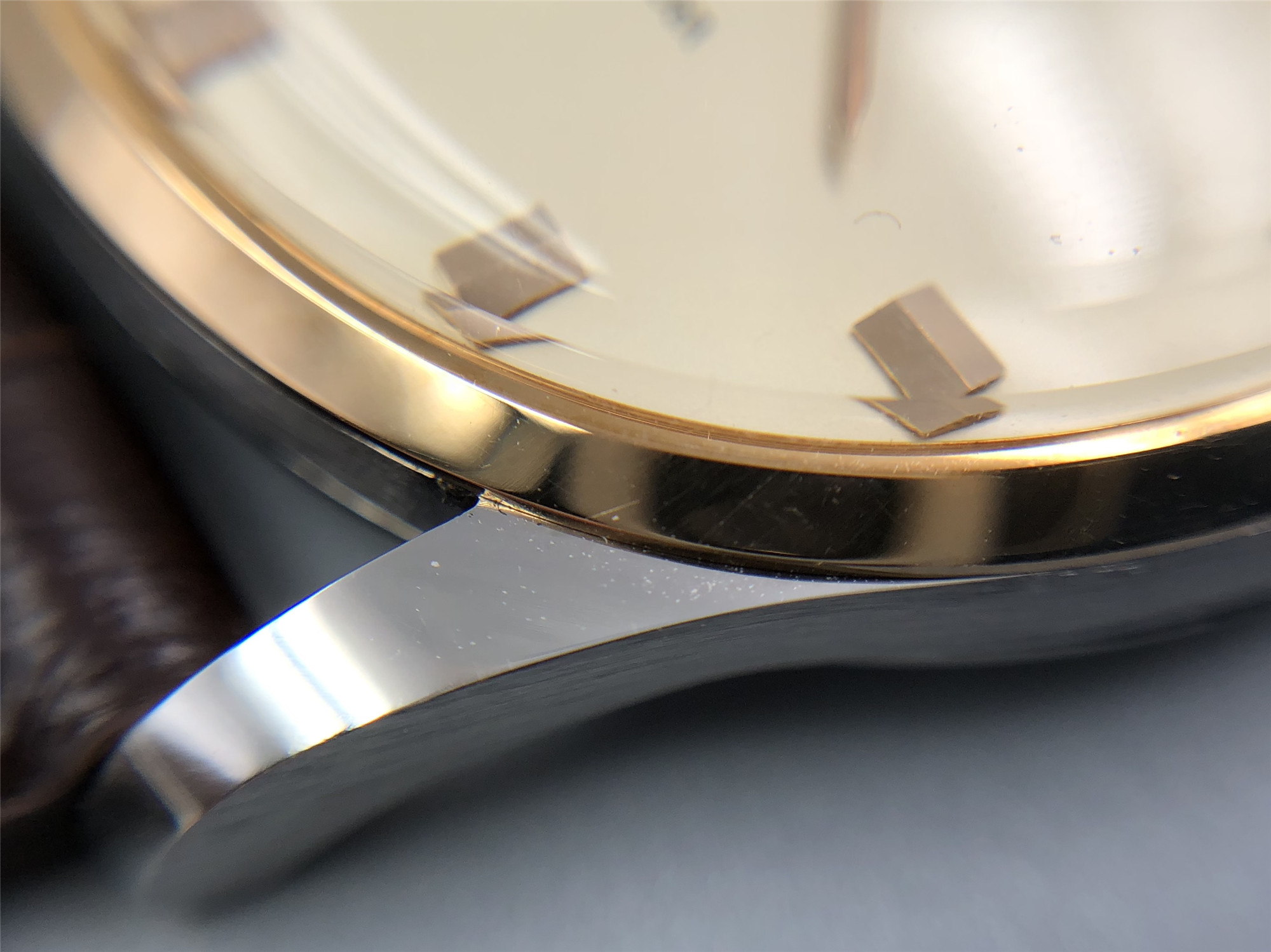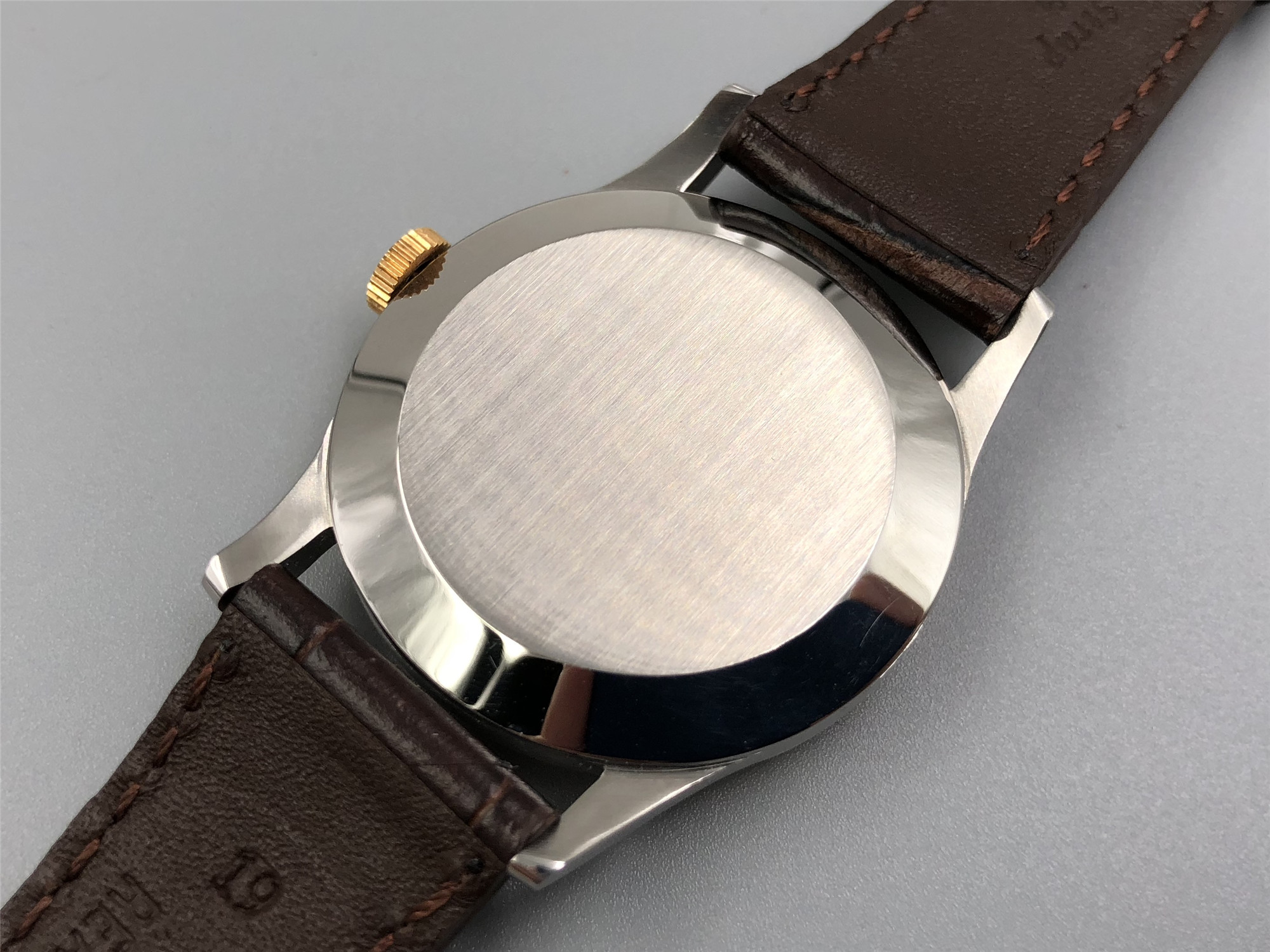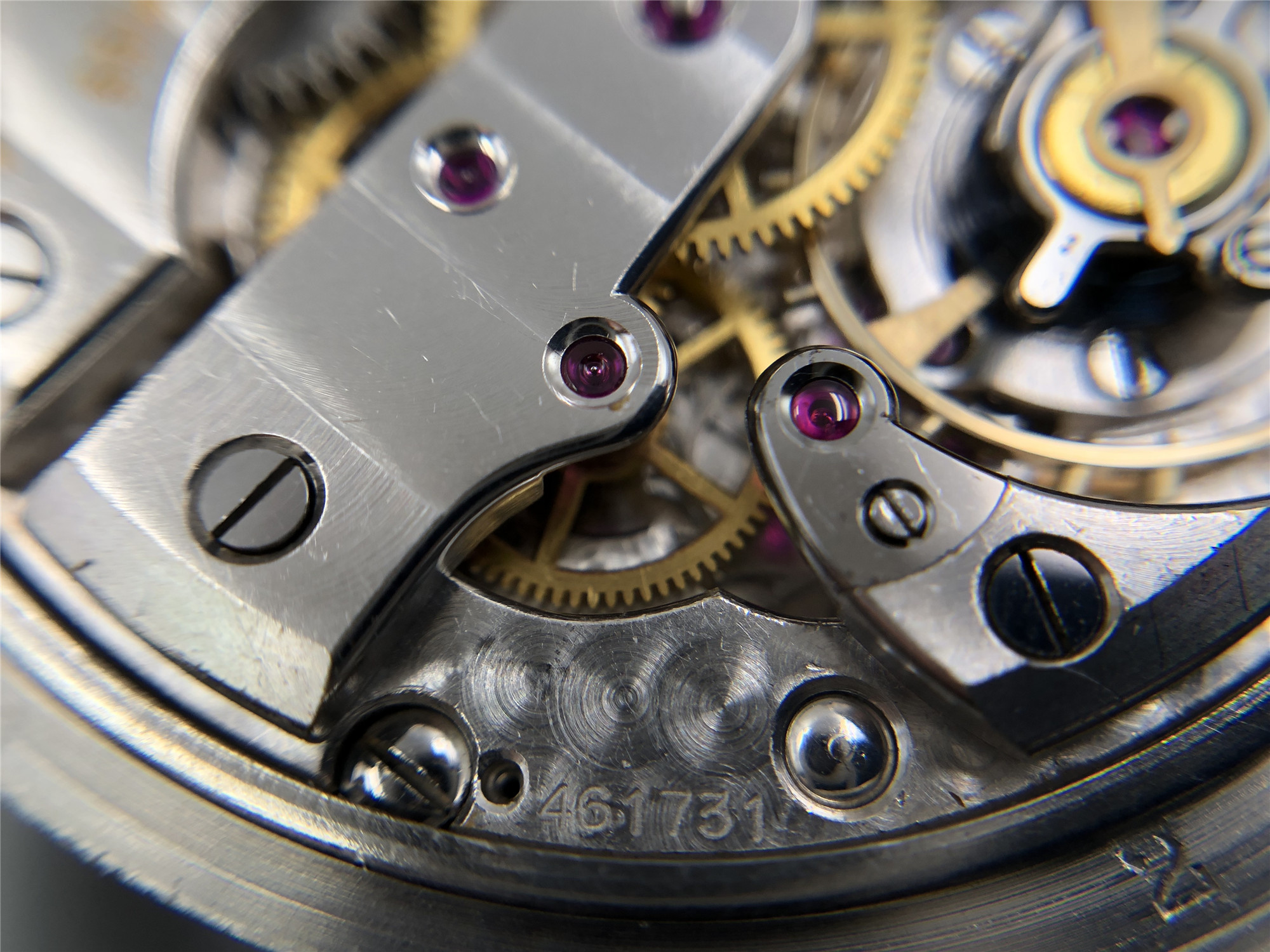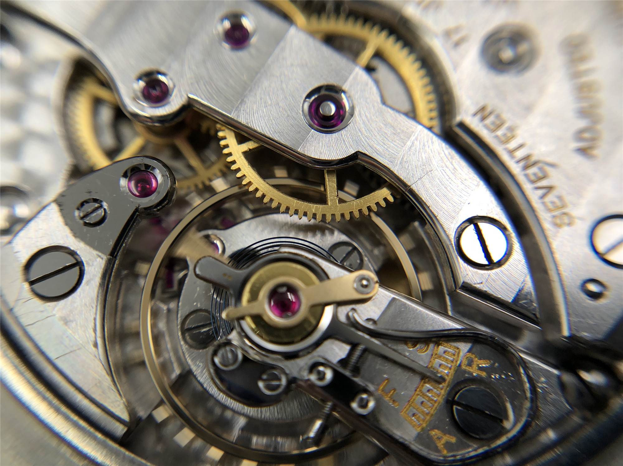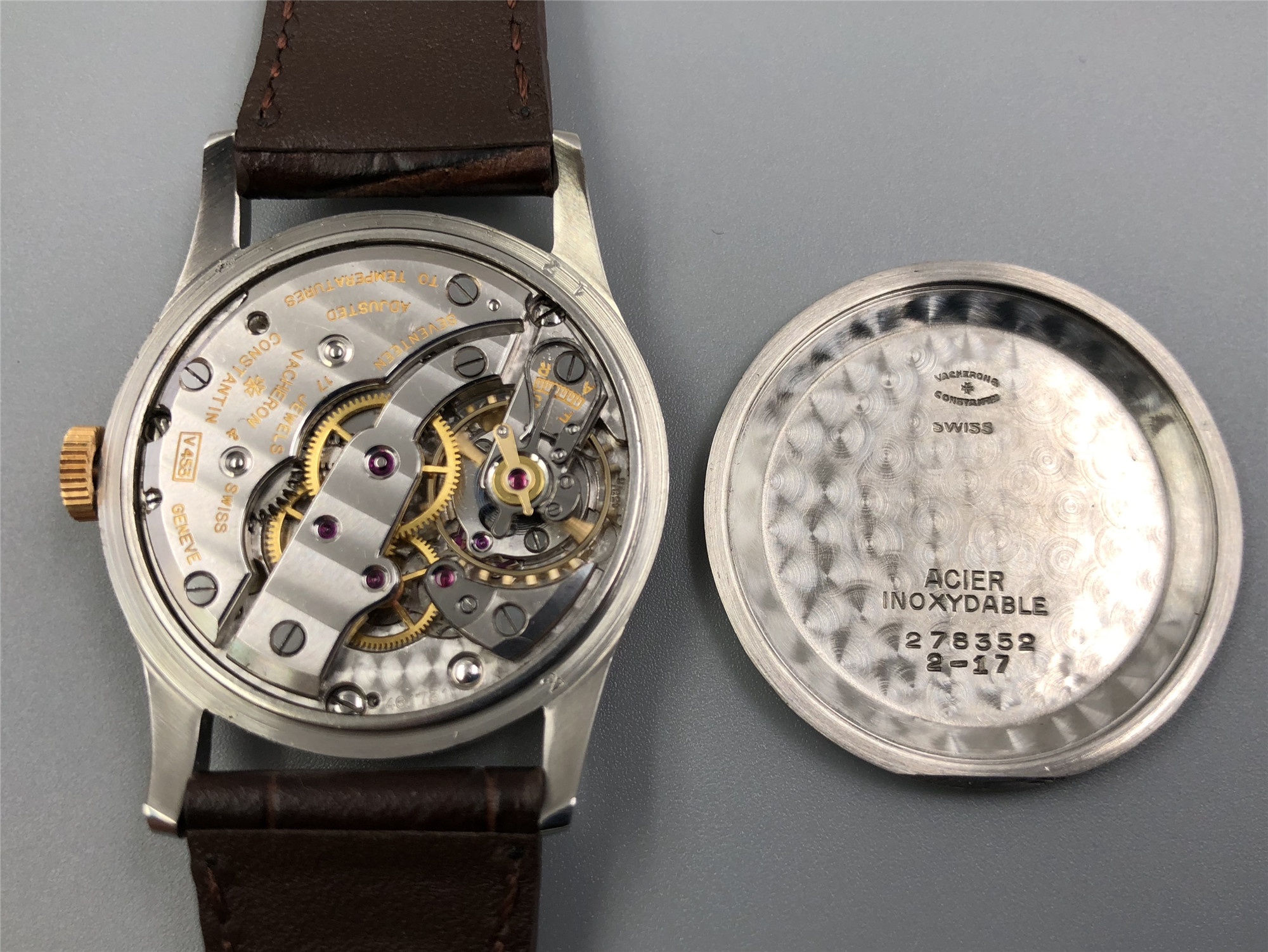 江诗丹顿腕表,约1945年。钢材质表壳,红金表圈、时标、指针和表冠,按压式底盖。手动上链机芯V453,17石,温度调整。银盘,方形斜面时标,巴顿指针,小秒针,外圈分钟刻度。表壳、盘面和机芯签名。典型的1940/1950年代风格,罕见的双色表壳和特殊盘面,简洁又极具个性,设计感十足。在70年后的今天看来,仍然是极佳的日内瓦高级制表作品,表壳锋利,机芯干净,上链顺滑,品相如新。