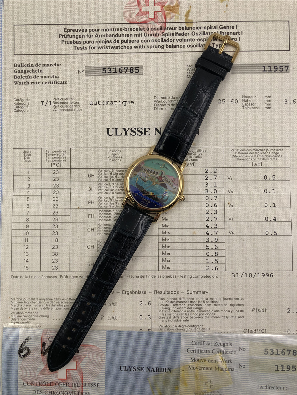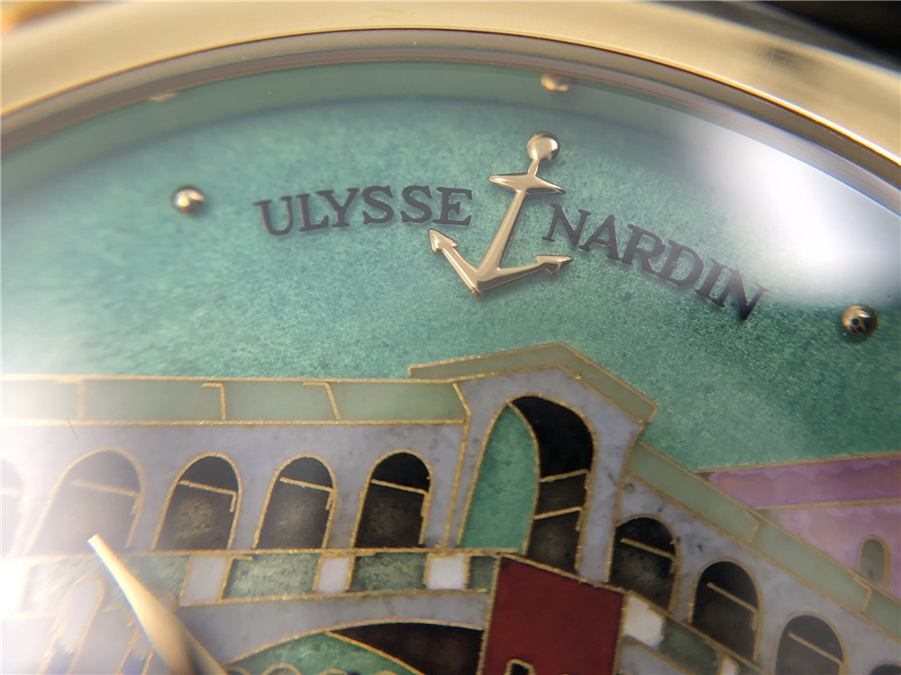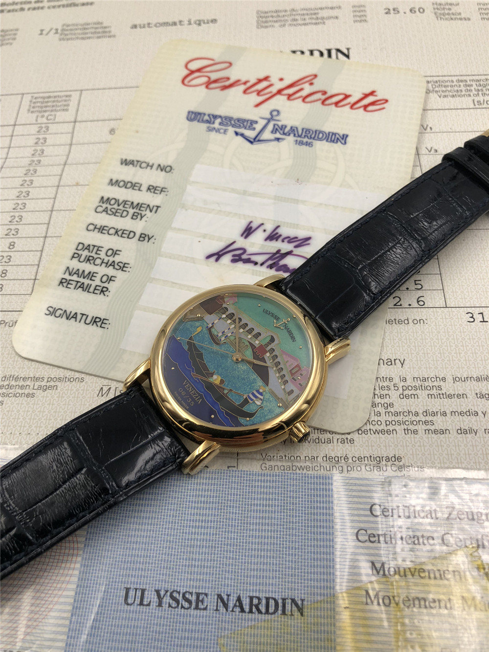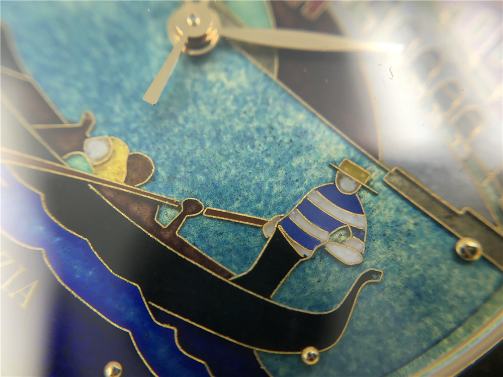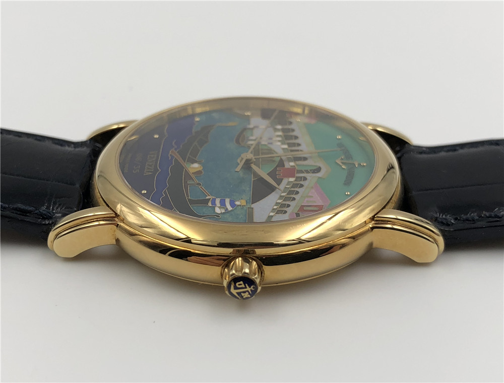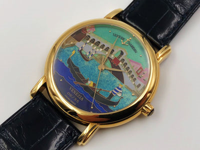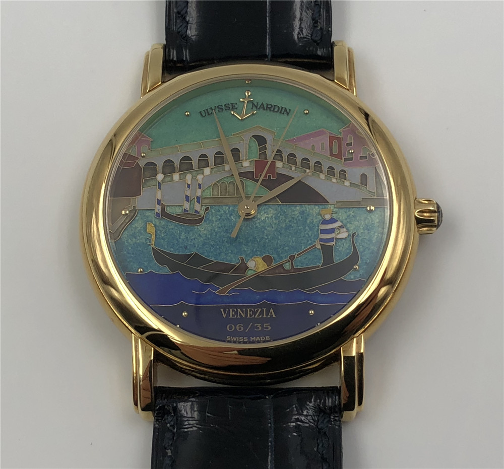 雅典限量腕表,18K黄金,掐丝珐琅表盘。主题威尼斯风景,描绘里亚托桥前的贡多拉。编号6/35,口径37mm,约1999年,自动上弦机芯cal. 2892A2,21石。附雅典证书和COSC证书。
