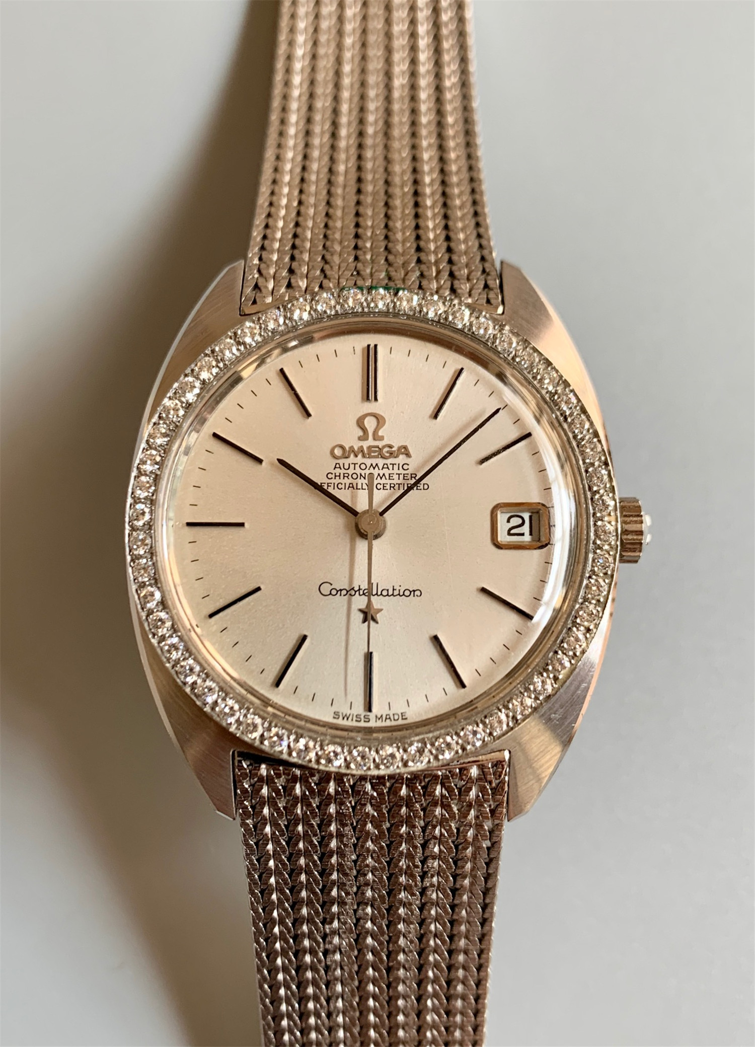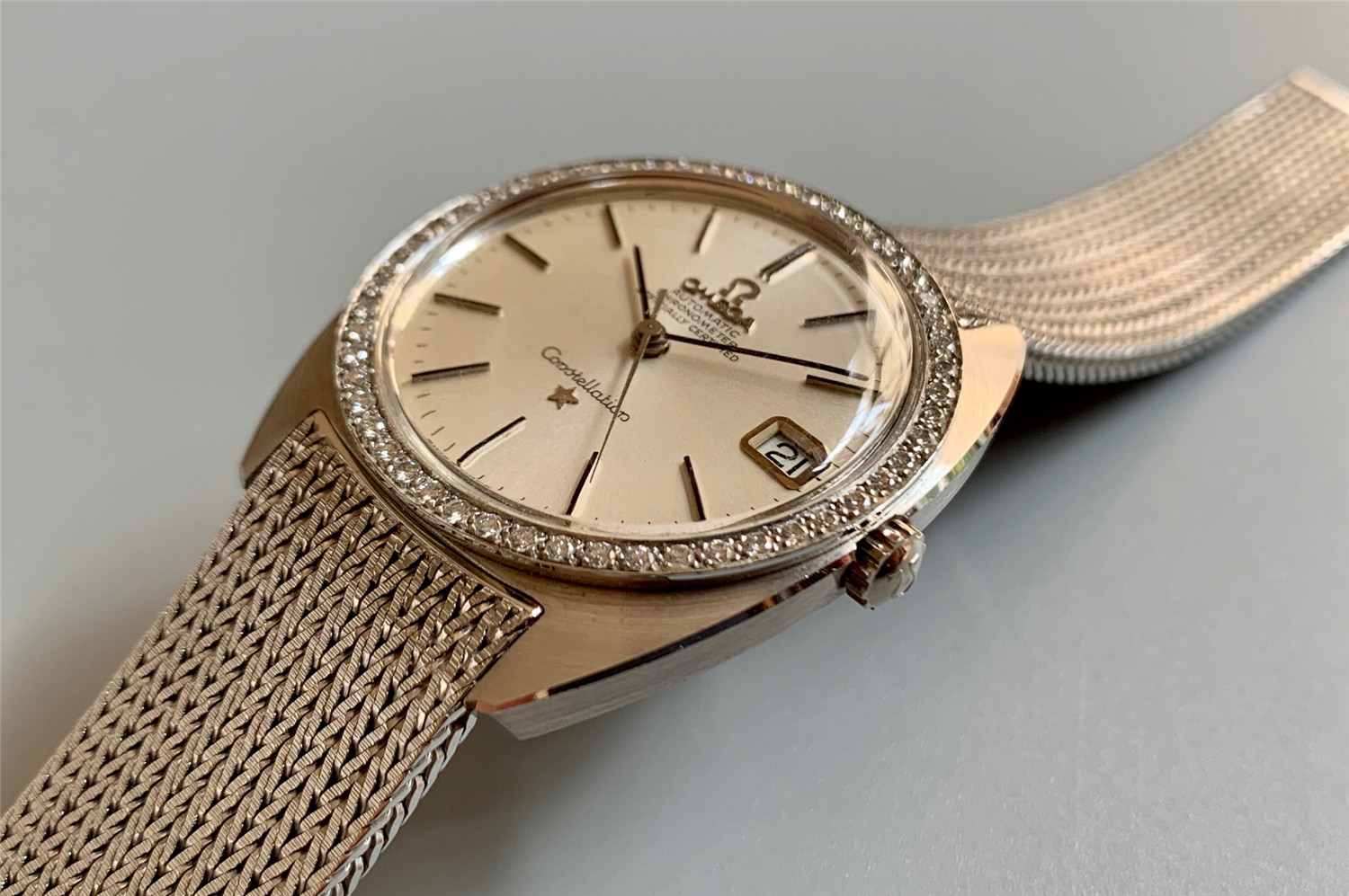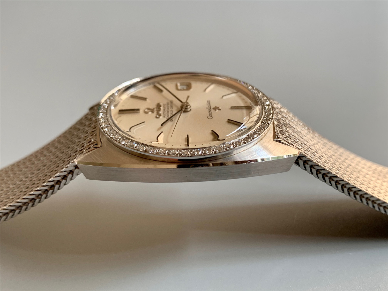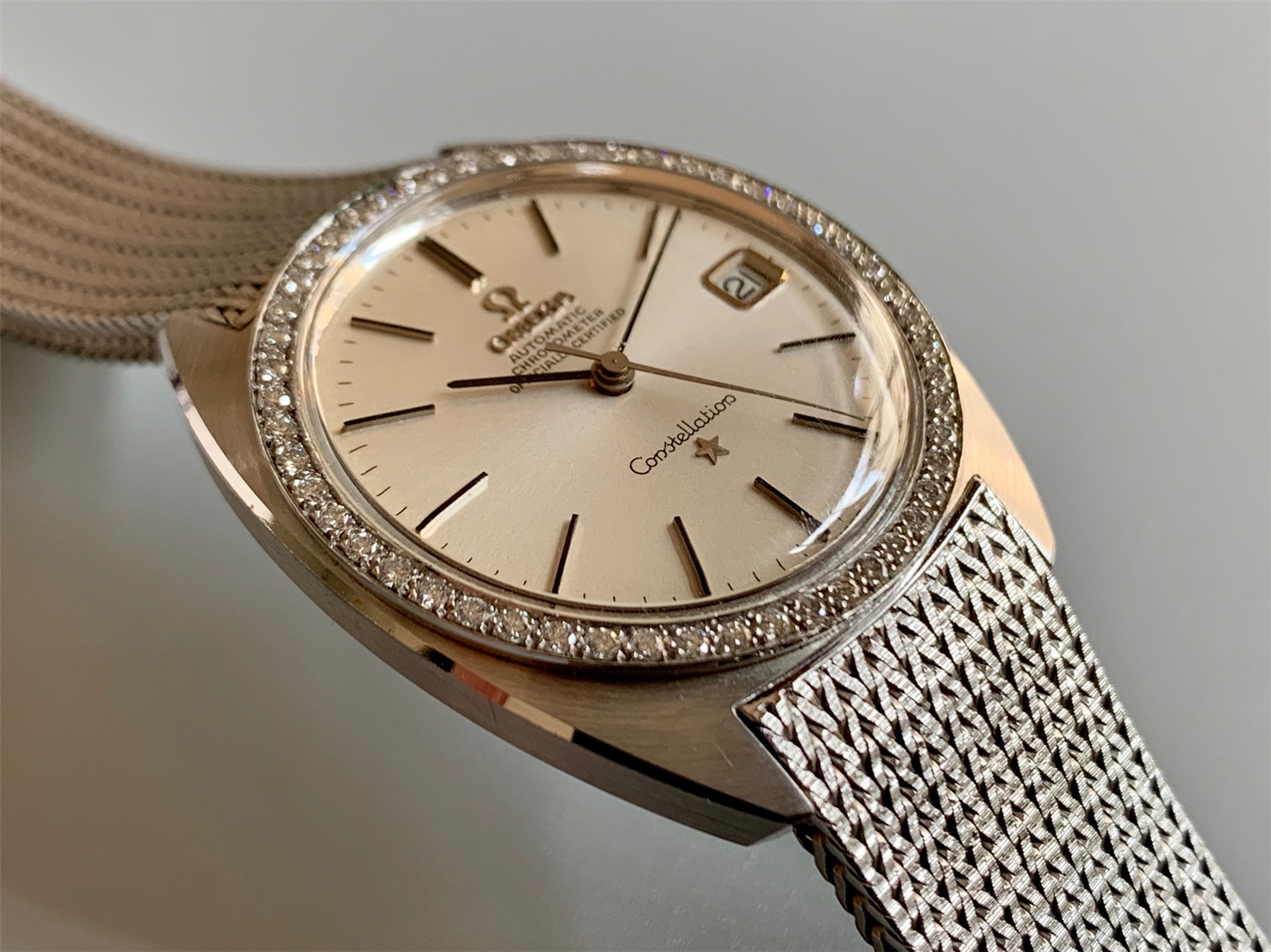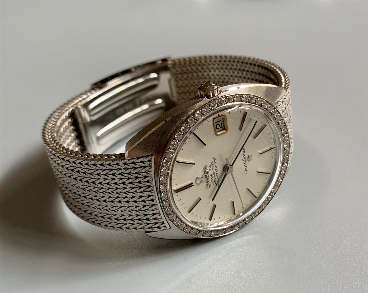 Omega Constellation,1966年,白金,钻石表圈,原装链带,自动机芯561,日期显示,口径35mm,旋入式底盖,附原装盒。