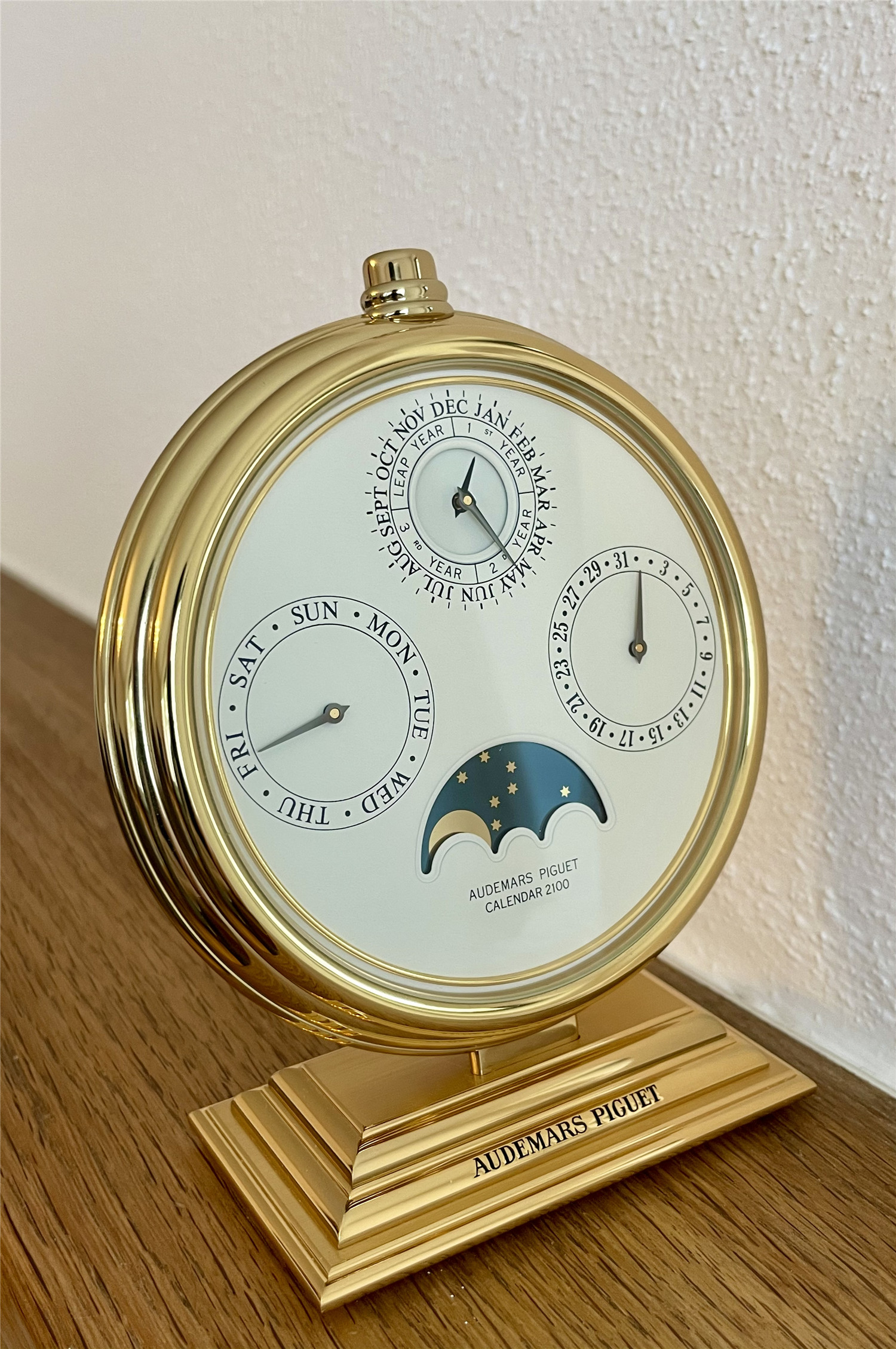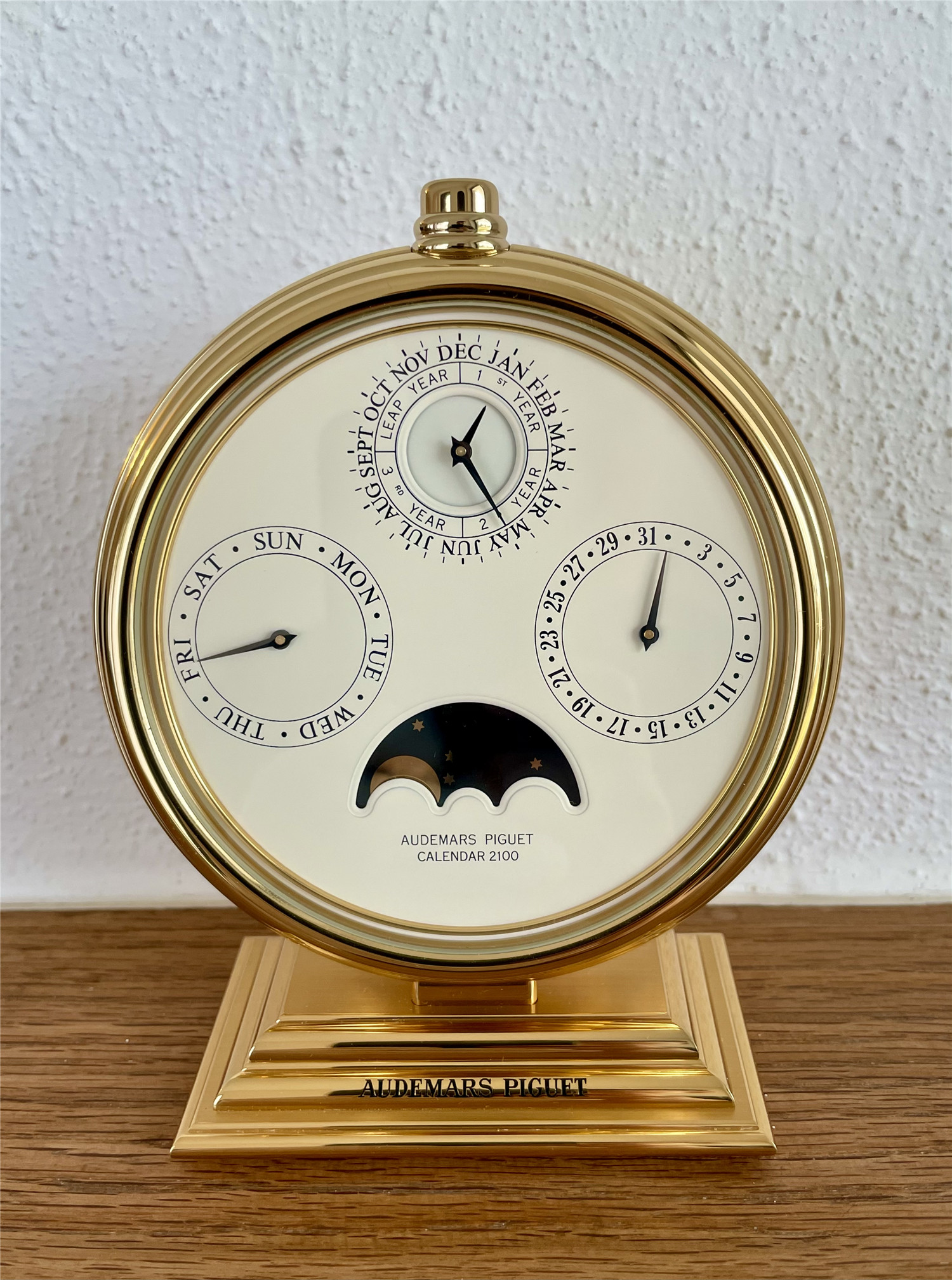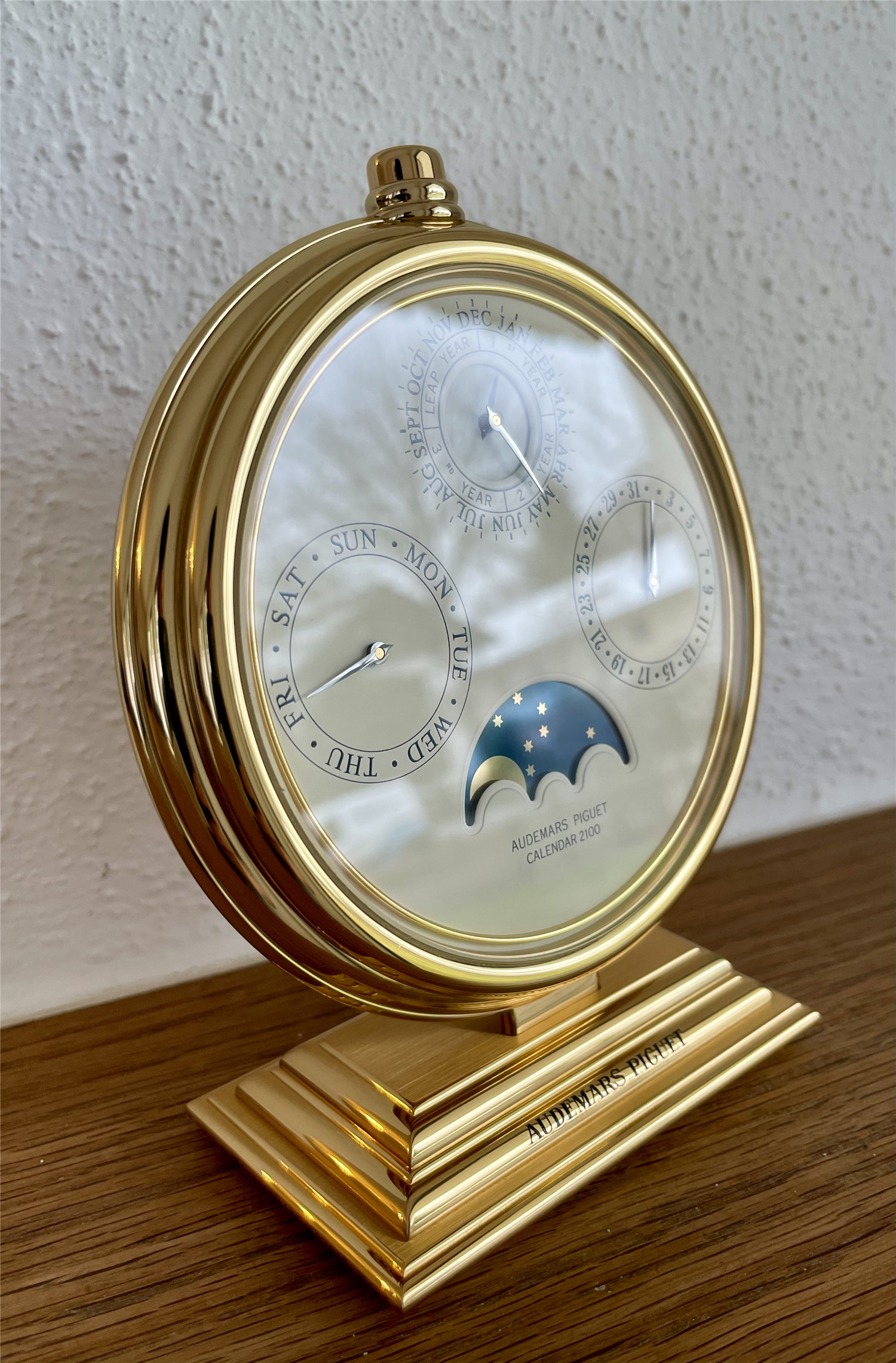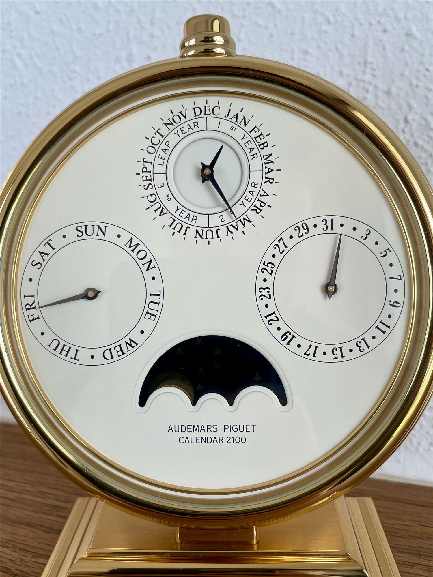 爱彼AUDEMARS PIGUET,罕见的桌面手动万年历。约1980年代,Ref.124,Calendar 2100,黄铜镀金,高143mm,宽114mm。手动机芯,32石。白色盘面,四个日历子盘,分别显示日期、星期、月份、闰年、月相,英语日历。盘面机芯和表壳签名,品相如新。
