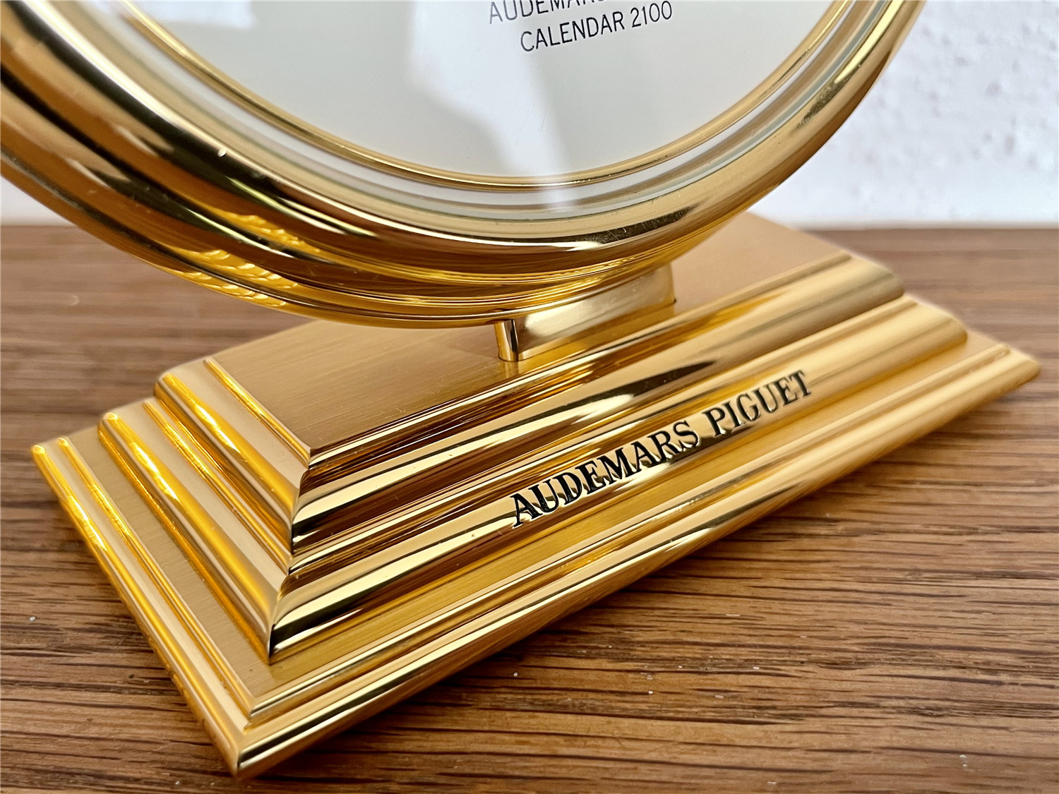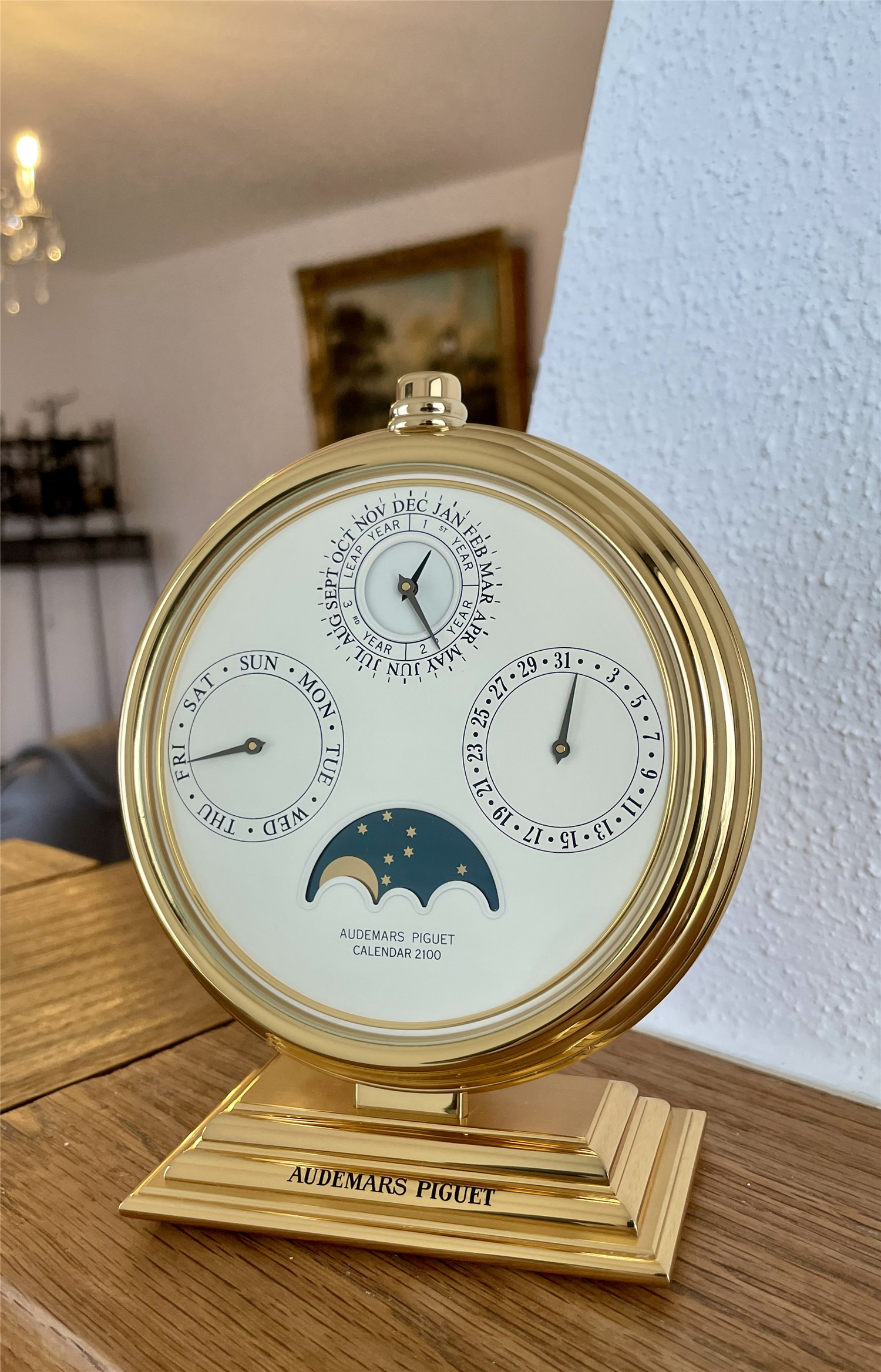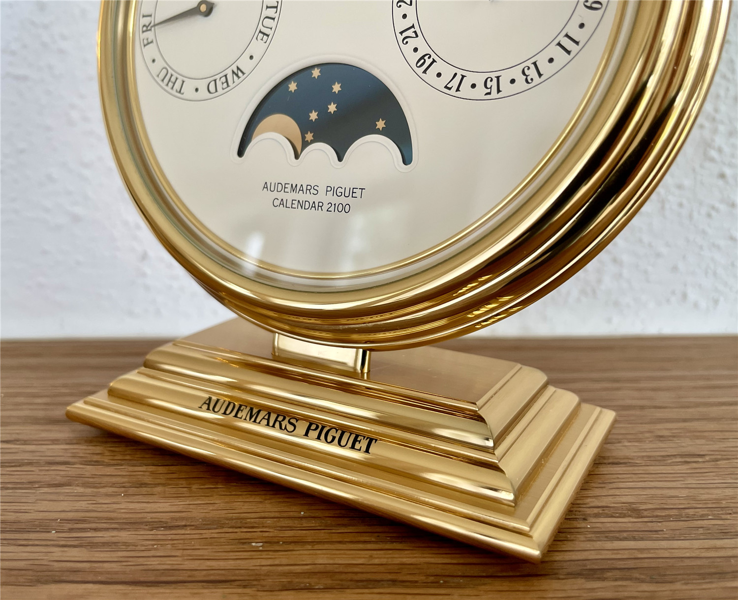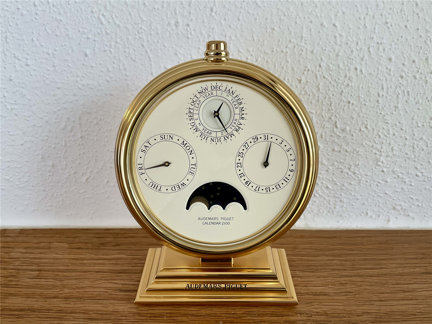 爱彼AUDEMARS PIGUET,罕见的桌面手动万年历。约1980年代,Ref.124,Calendar 2100,黄铜镀金,高143mm,宽114mm。手动机芯,32石。白色盘面,四个日历子盘,分别显示日期、星期、月份、闰年、月相,英语日历。盘面机芯和表壳签名,品相如新。