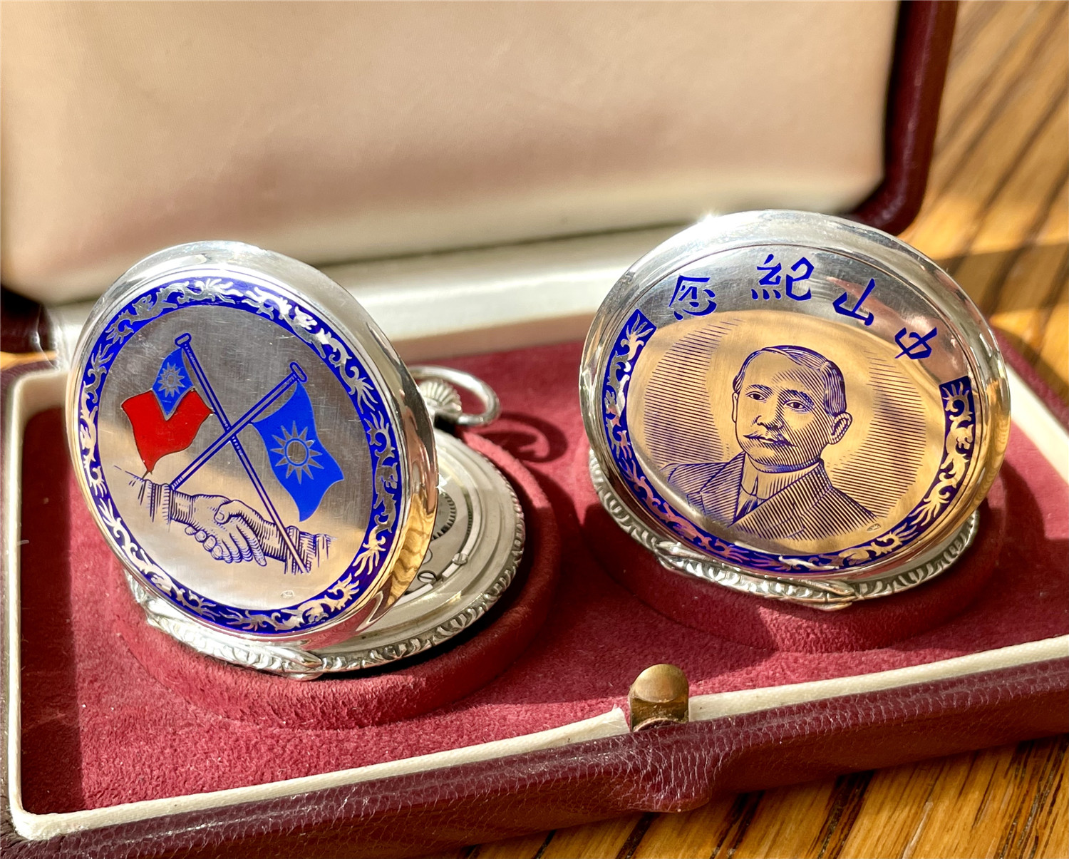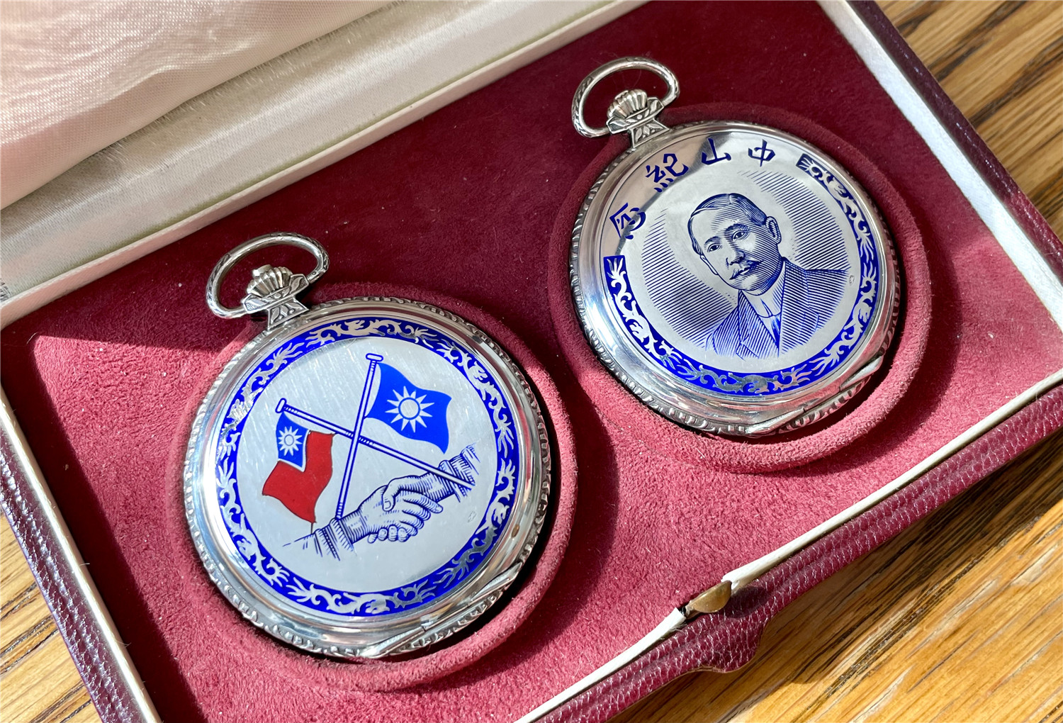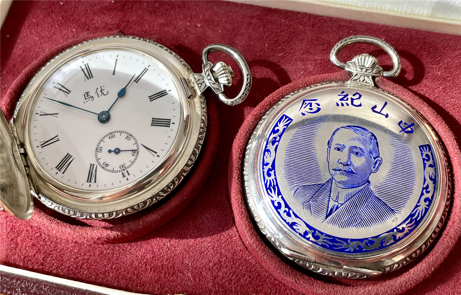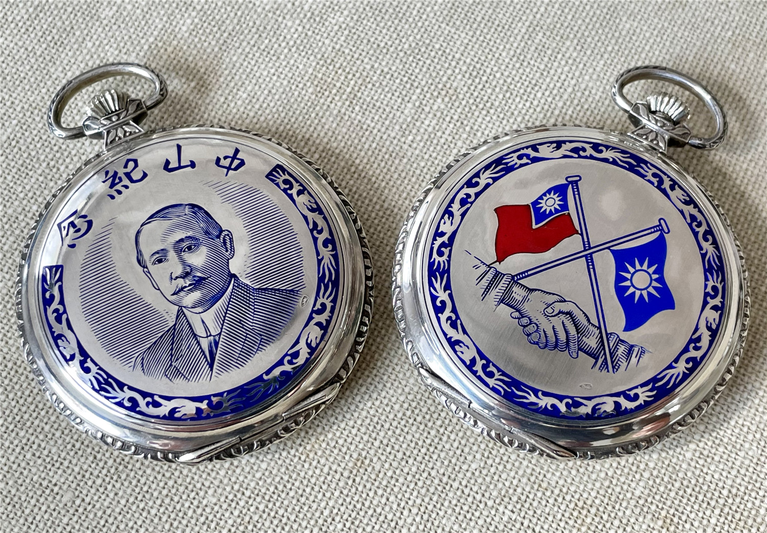 “中山纪念”,银材质怀表一对,约1920年代,口径45mm,附原装盒。无钥上链超薄猎表,表壳以蓝色珐琅描绘孙中山半身像,及“中山纪念”,另一面为珐琅描绘的中华民国国旗“青天白日满地红”、国民党党旗“青天白日旗”。表壳连续编号7992及7993。白色珐琅盘面,签名 “优马”,罗马字,小秒针,外圈分钟刻度,蓝钢梨形指针。机芯签名Cyma Tavannes,Ref.564K,镀铑,17石,杠杆擒纵,螺丝摆轮,宝玑游丝。