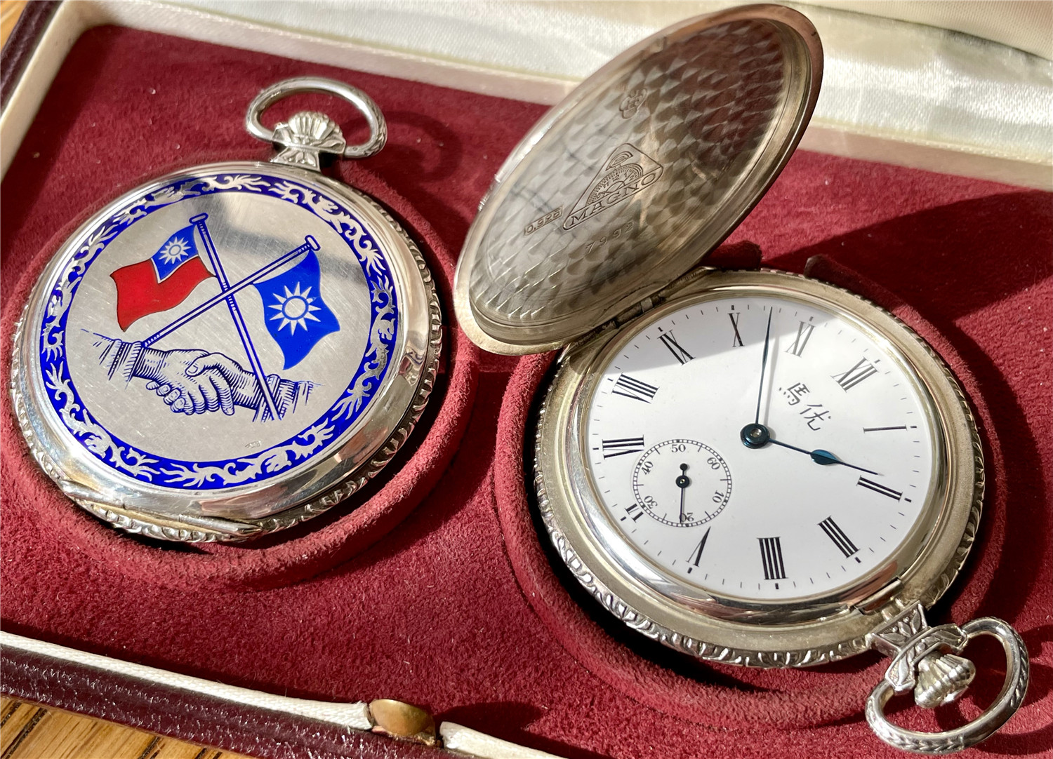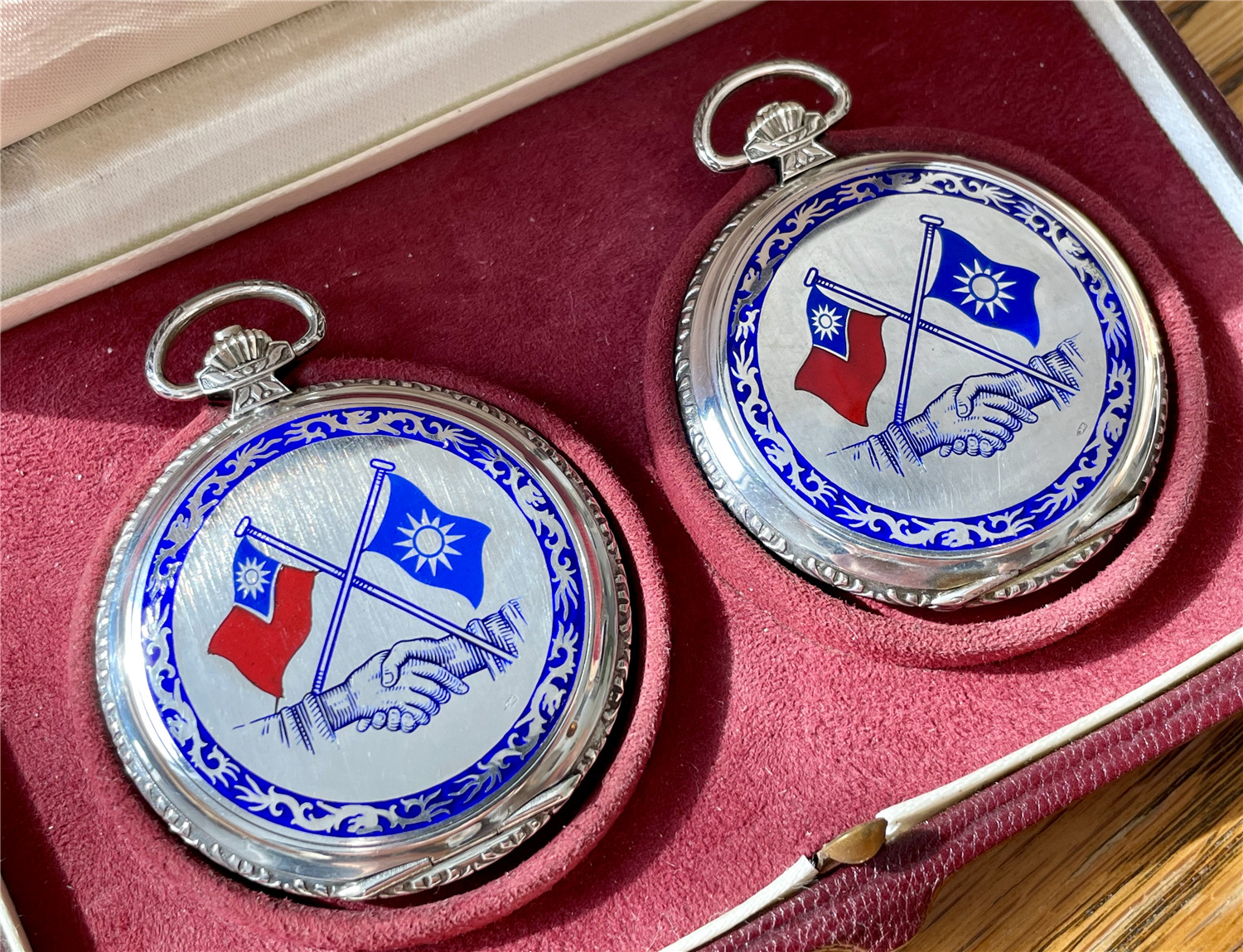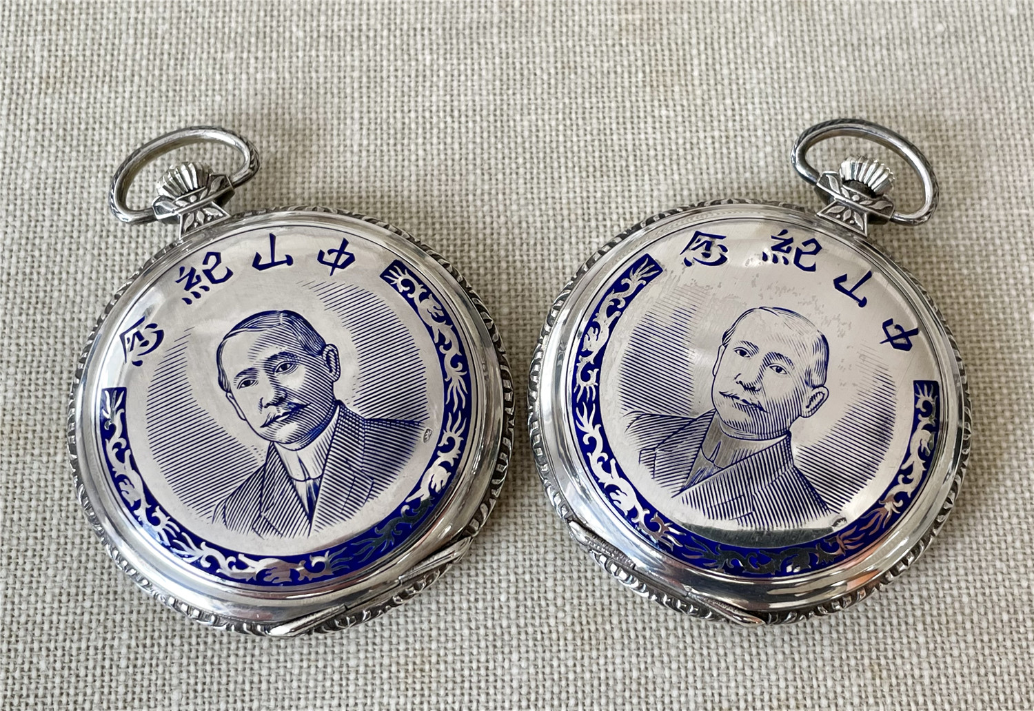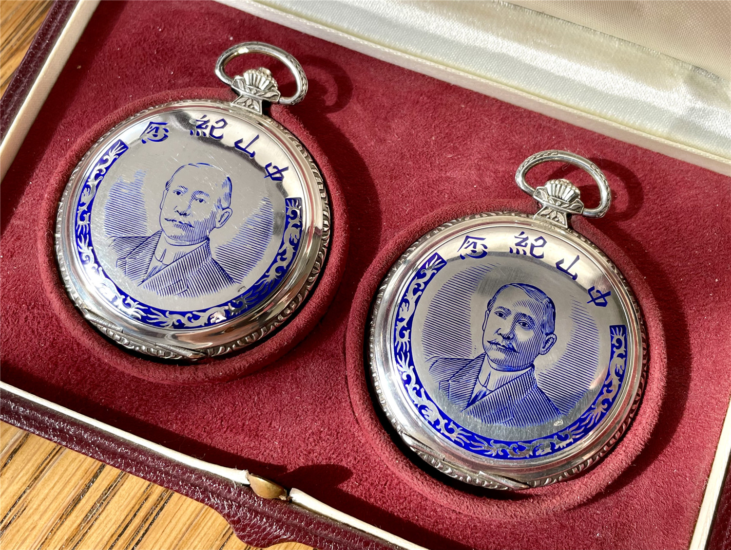 “中山纪念”,银材质怀表一对,约1920年代,口径45mm,附原装盒。无钥上链超薄猎表,表壳以蓝色珐琅描绘孙中山半身像,及“中山纪念”,另一面为珐琅描绘的中华民国国旗“青天白日满地红”、国民党党旗“青天白日旗”。表壳连续编号7992及7993。白色珐琅盘面,签名 “优马”,罗马字,小秒针,外圈分钟刻度,蓝钢梨形指针。机芯签名Cyma Tavannes,Ref.564K,镀铑,17石,杠杆擒纵,螺丝摆轮,宝玑游丝。