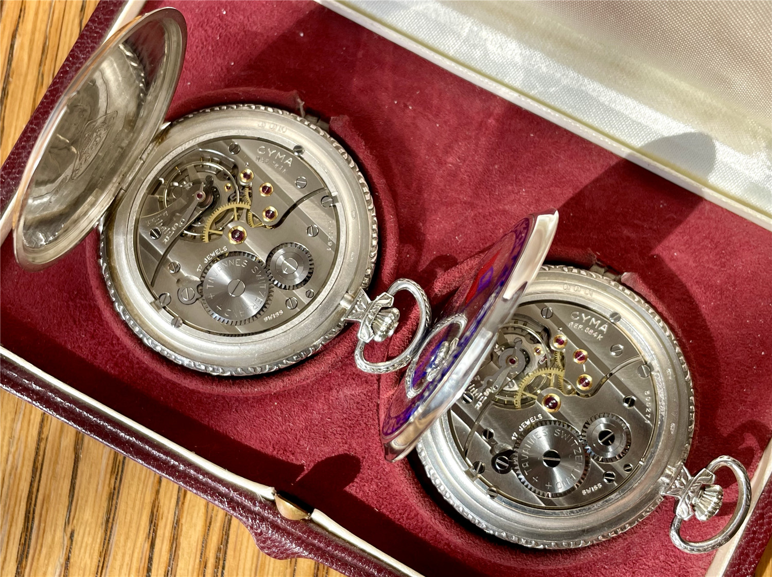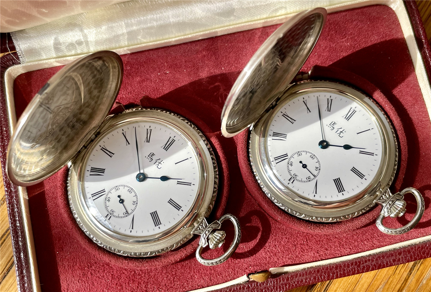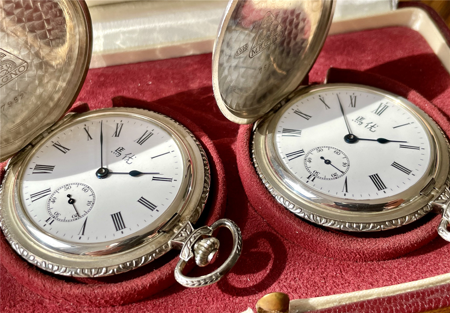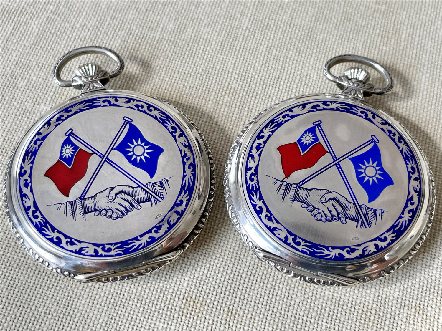 “中山纪念”,银材质怀表一对,约1920年代,口径45mm,附原装盒。无钥上链超薄猎表,表壳以蓝色珐琅描绘孙中山半身像,及“中山纪念”,另一面为珐琅描绘的中华民国国旗“青天白日满地红”、国民党党旗“青天白日旗”。表壳连续编号7992及7993。白色珐琅盘面,签名 “优马”,罗马字,小秒针,外圈分钟刻度,蓝钢梨形指针。机芯签名Cyma Tavannes,Ref.564K,镀铑,17石,杠杆擒纵,螺丝摆轮,宝玑游丝。