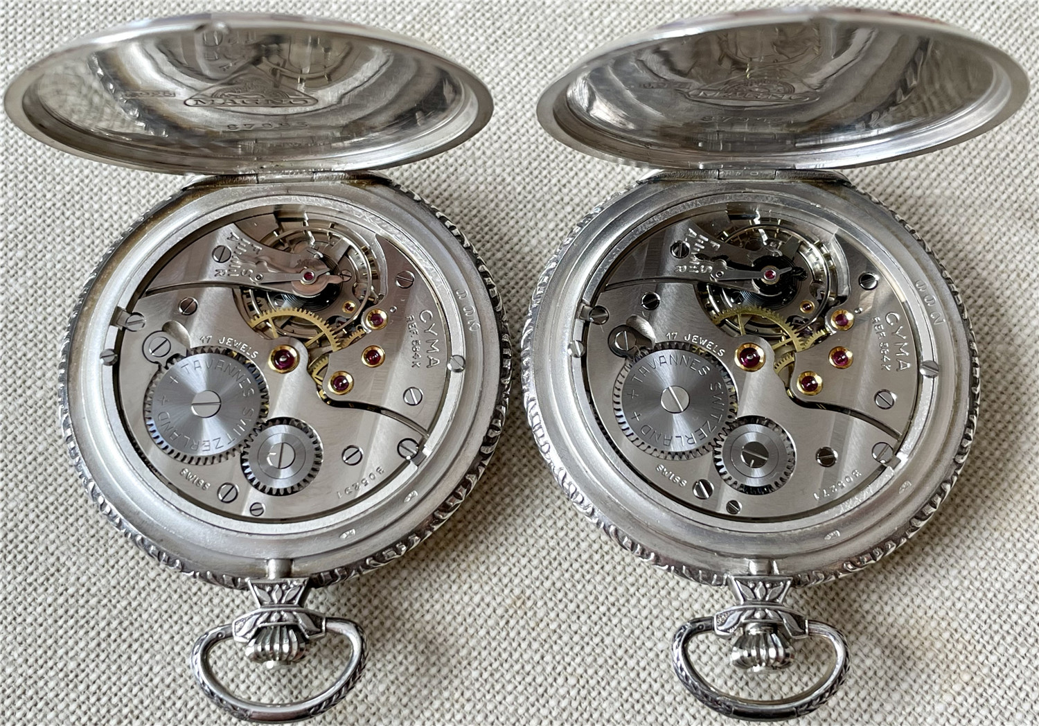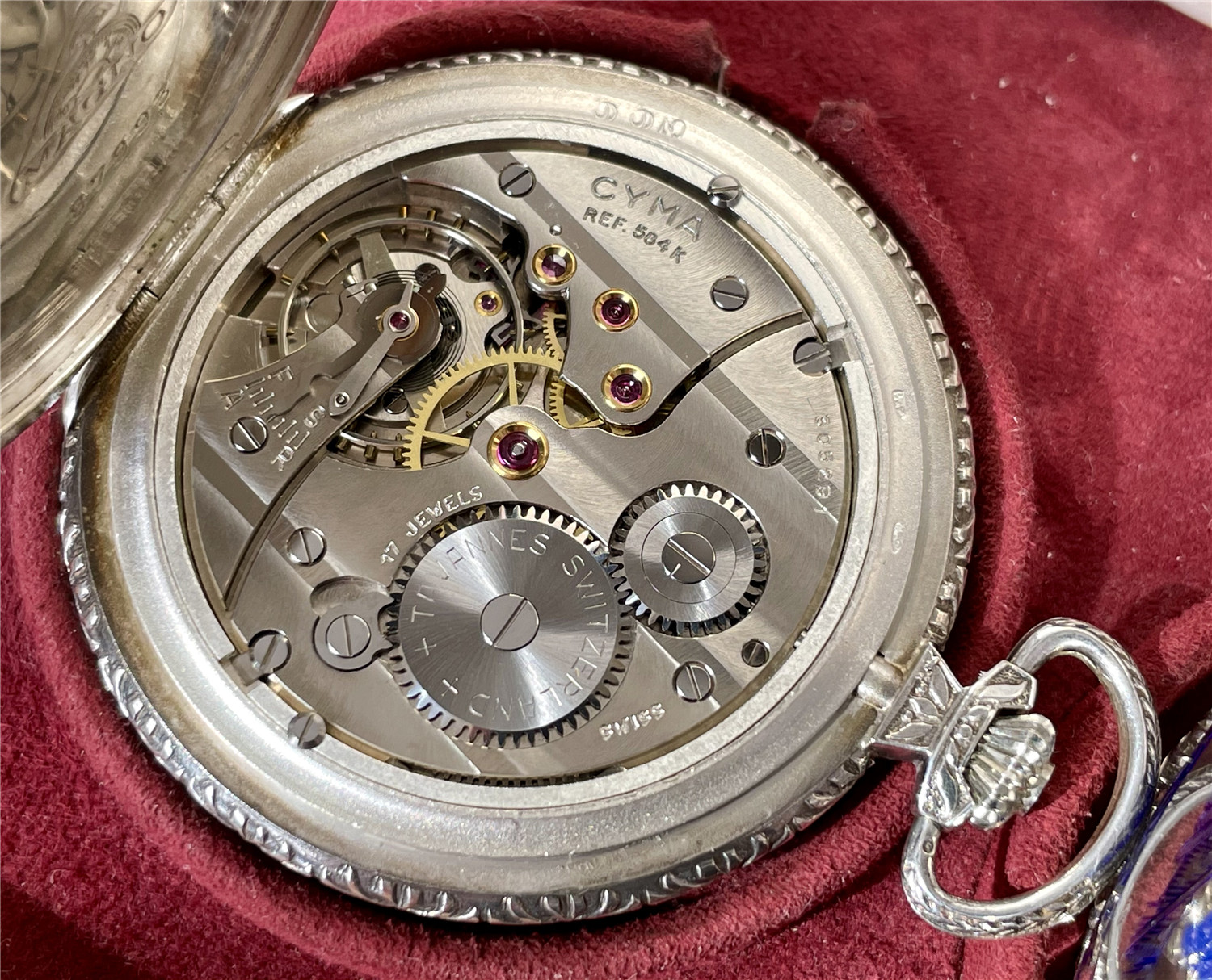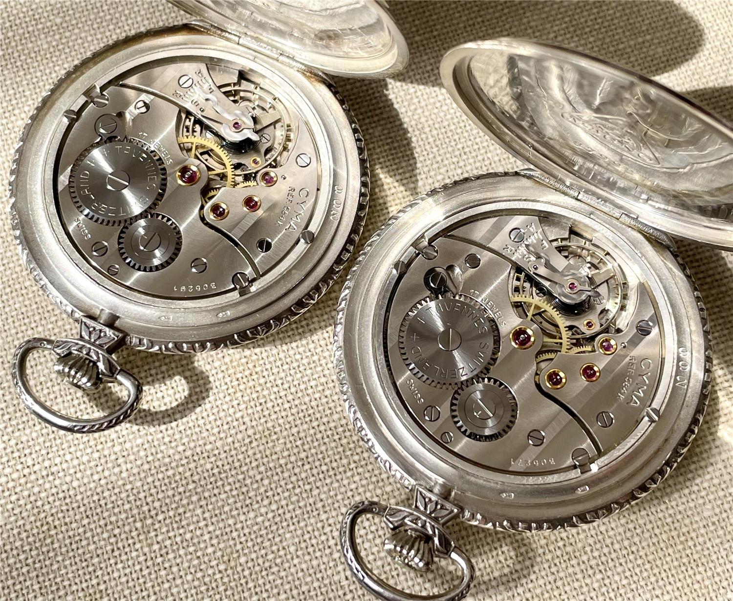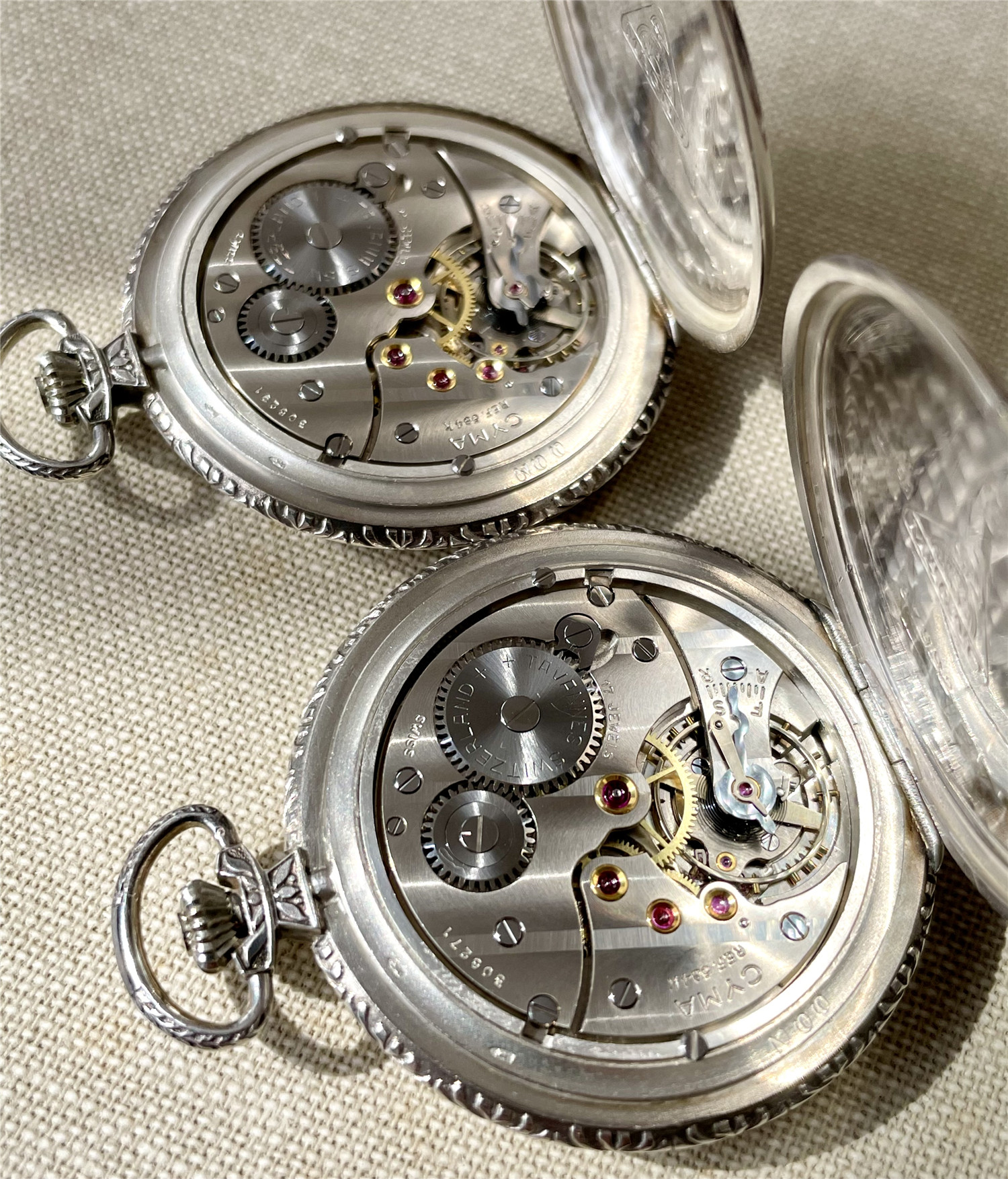 “中山纪念”,银材质怀表一对,约1920年代,口径45mm,附原装盒。无钥上链超薄猎表,表壳以蓝色珐琅描绘孙中山半身像,及“中山纪念”,另一面为珐琅描绘的中华民国国旗“青天白日满地红”、国民党党旗“青天白日旗”。表壳连续编号7992及7993。白色珐琅盘面,签名 “优马”,罗马字,小秒针,外圈分钟刻度,蓝钢梨形指针。机芯签名Cyma Tavannes,Ref.564K,镀铑,17石,杠杆擒纵,螺丝摆轮,宝玑游丝。